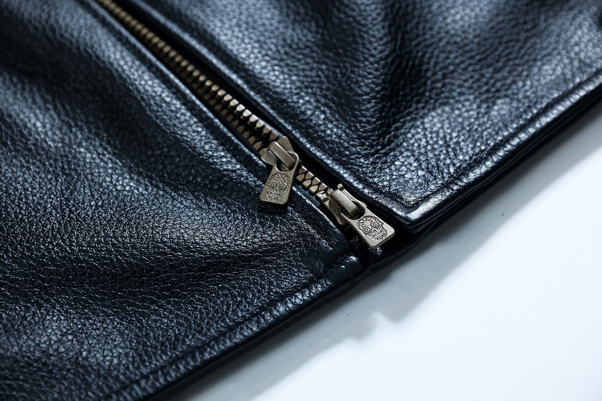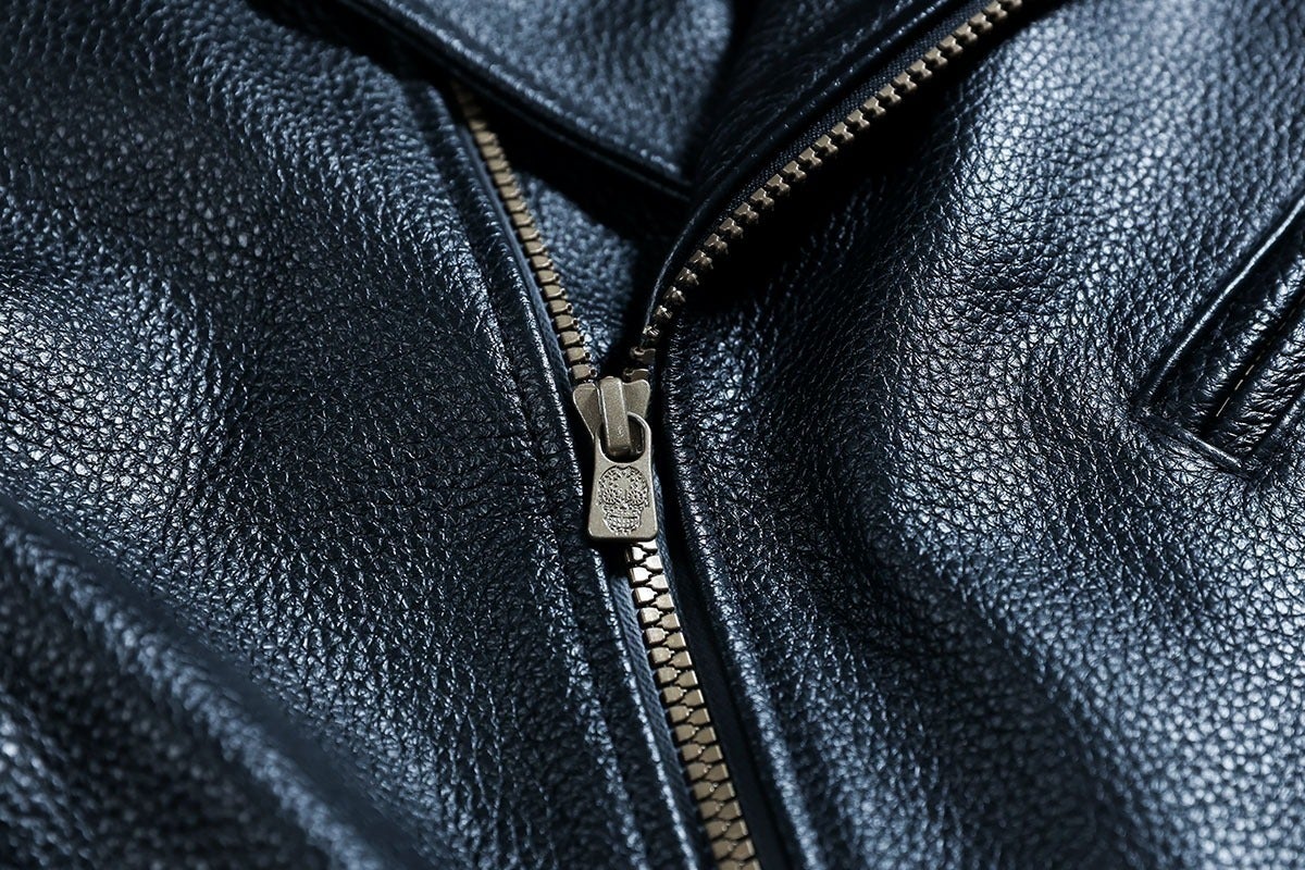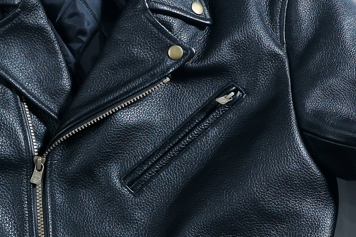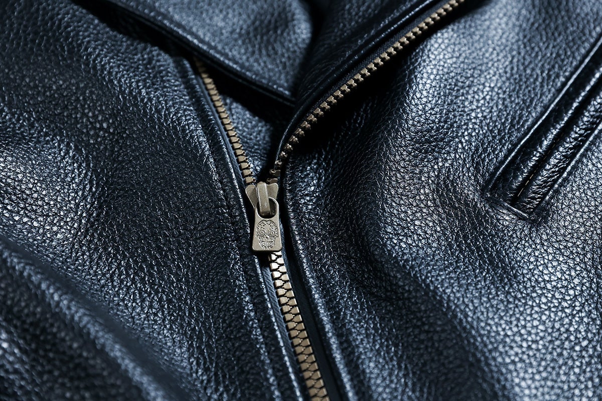 レザージャケットは「機能性×デザイン」の両立を追求しました。ジップ、ボタンなどの副資材はアンティークゴールドで統一。