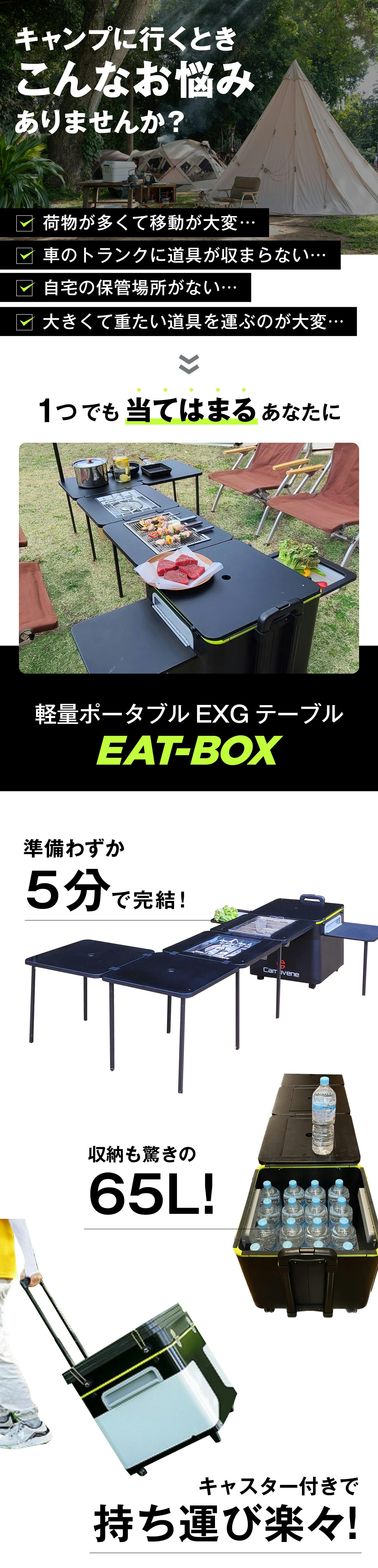 EXGキャンプテーブルEAT-BOXは、デザインも利便性も含めて、キャンプが大好きな方なら誰でも欲しいと思えるキャンプキッチンを目指して製作しました。