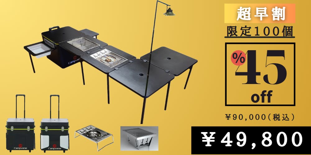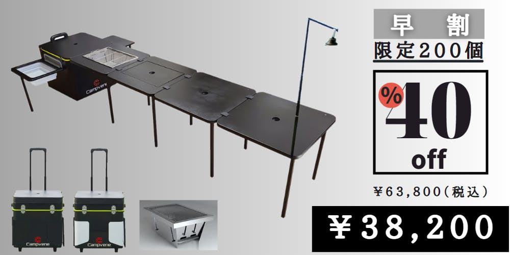 「キャンプやアウトドアでBBQもしてみたいけど用意が面倒」「キャンプでは荷物が多いしテーブルも大きくなるからすべて揃えられない」「キャンプグッズを別々に保管するのは嫌だ」このような理由でワンランク上のキャンプやBBQを諦めていらっしゃる方にも、アウトドアをさらに満喫したいと思っていただけるきっかけとなれば光栄です。