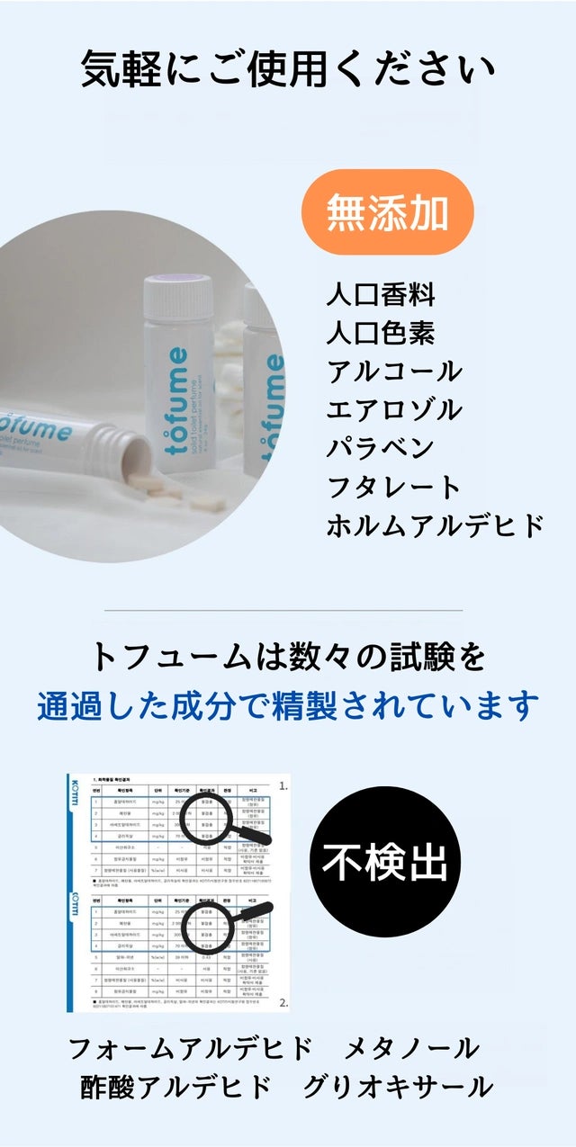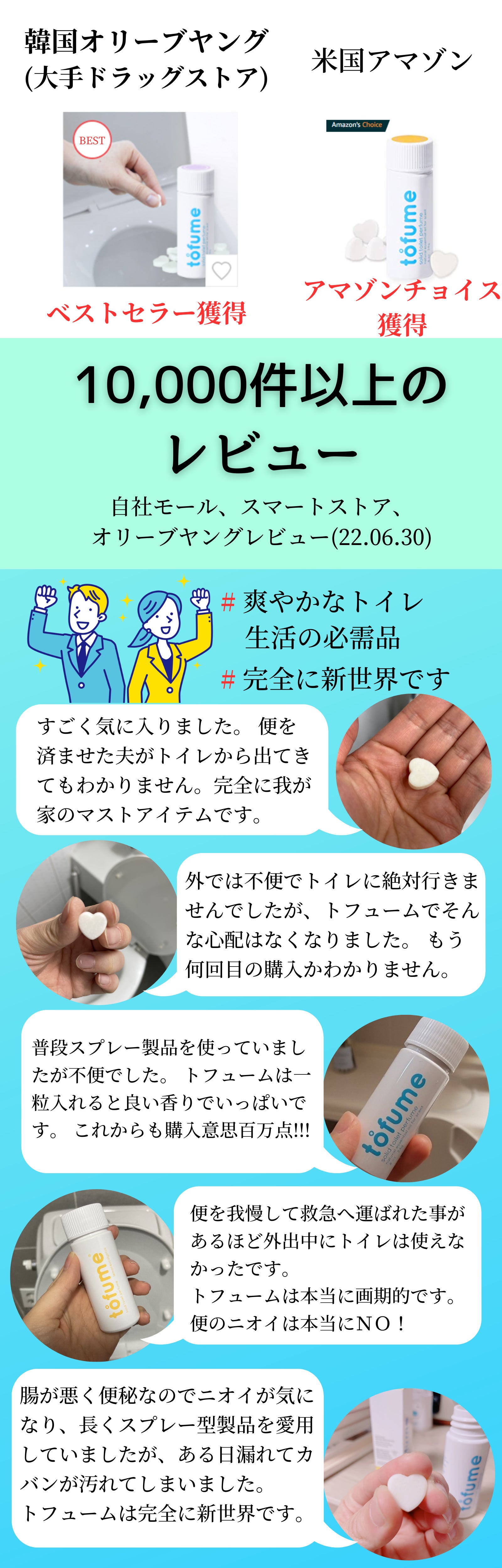 A トフュームはニオイの原因を遮断して除去するため、非常に効果的に芳香剤としても力を発揮します。従来のトイレ芳香剤は、トイレのニオイを香りで覆う役割を果たしています。 これらの製品はニオイと香りが混ざるようになり、むしろ不快な結果を招くことがあります。 しかし tofumeを1粒落とすと、通常の場合は(広さにより異なる)2~3時間程度効果的に力を発揮します。 トイレを閉める場合は更に持続力があがり、実際にトイレの芳香剤として使用される方の満足度は高いです。