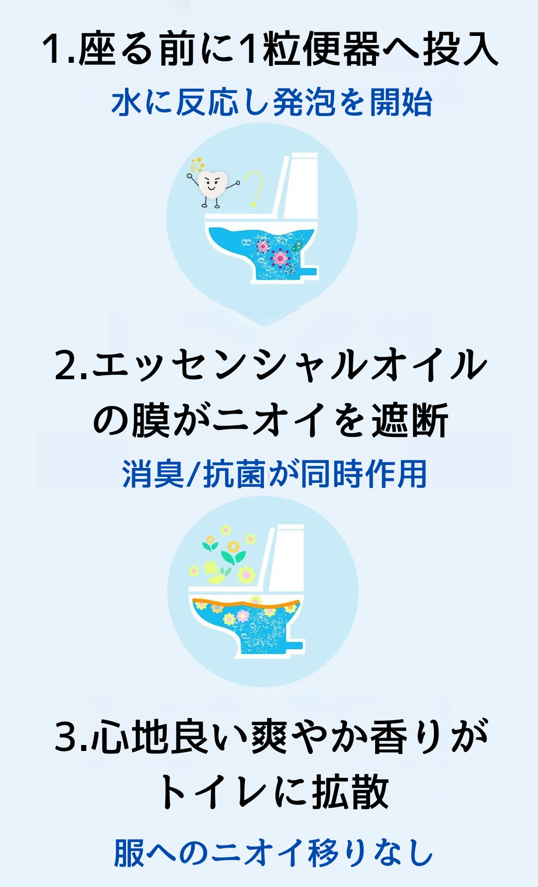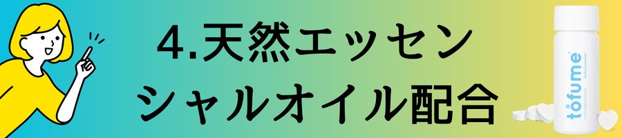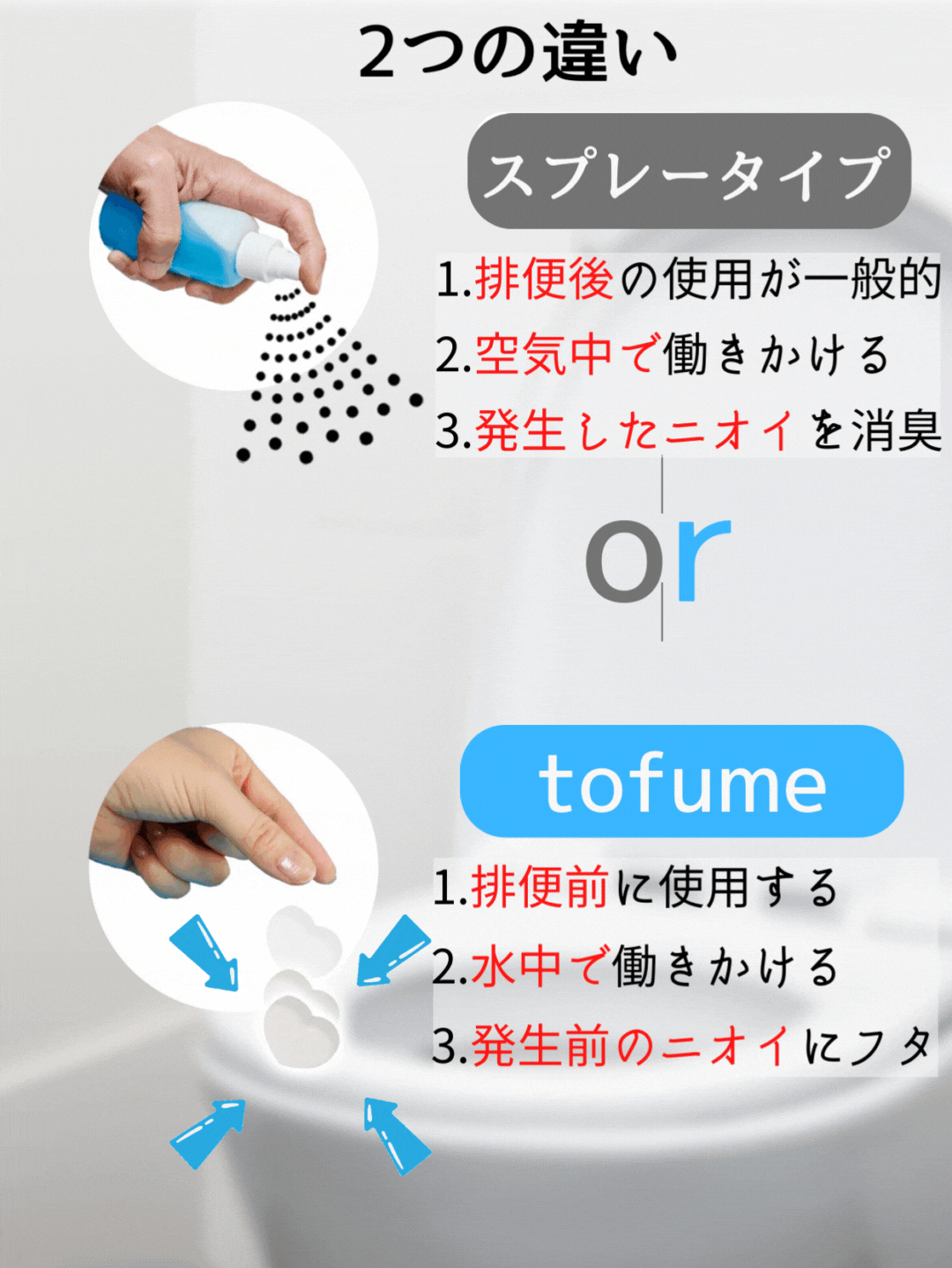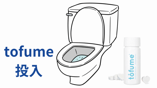 tofumeは、発泡タブレット(錠剤)をトイレで座る前に使用するのが特徴。タブレットが水に溶けだすと水面にオイルの消臭バリヤを作る仕組み。バリヤを張ると抗菌作用と香りが広がり始めるので誰も気にしない心地良いトイレ時間が始まります。