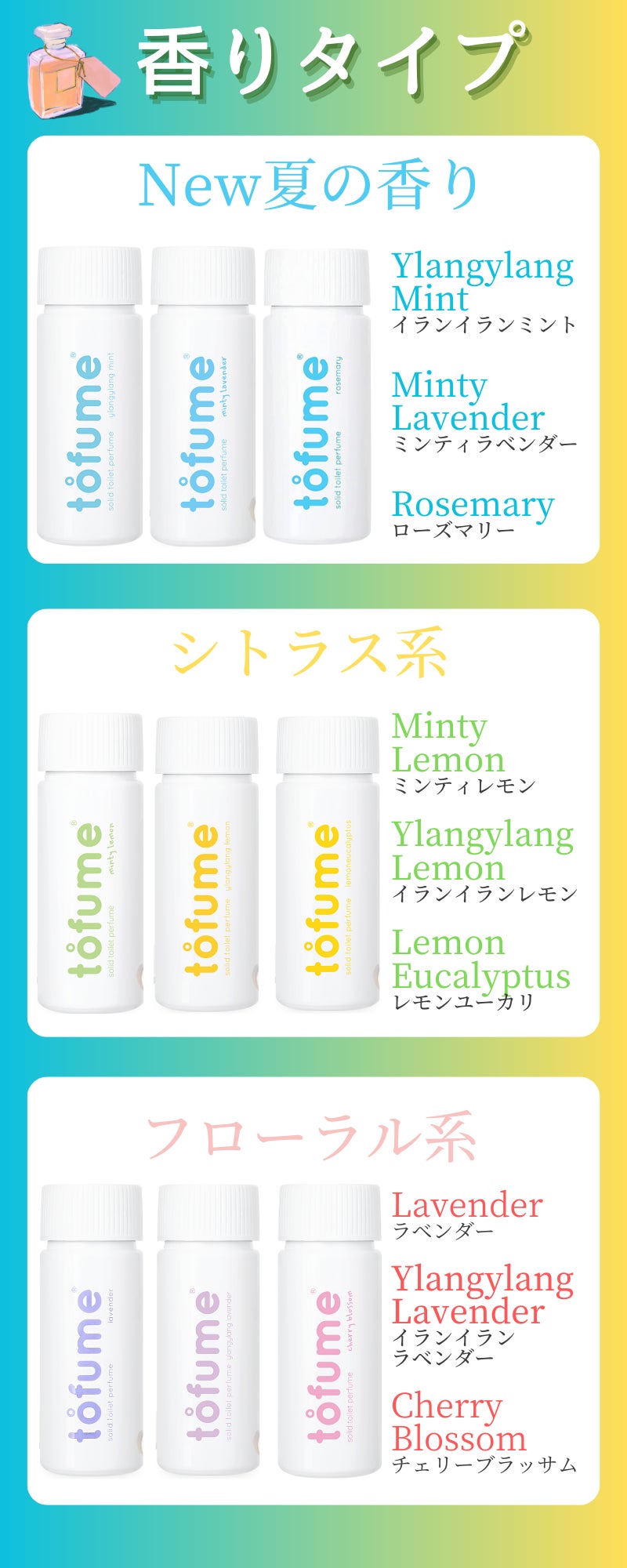 「tofume」は、必ず誰もが毎日使用するトイレ事情に着眼し、多くの人が経験している気分が重くなる瞬間(ニオイ)を少しでも回避できる何かがあれば?そんな発想から研究・開発が始まりました。簡単使用で持運びができ、消臭抗菌が可能ならどんなに良いか、更に香りも弱すぎず強すぎない飽きの来ないモノを作りたい。我々の「tofume」はそのすべてを解決している製品です。皆様の期待を裏切らず喜んでいただけると信じていますので是非一度お試しください。