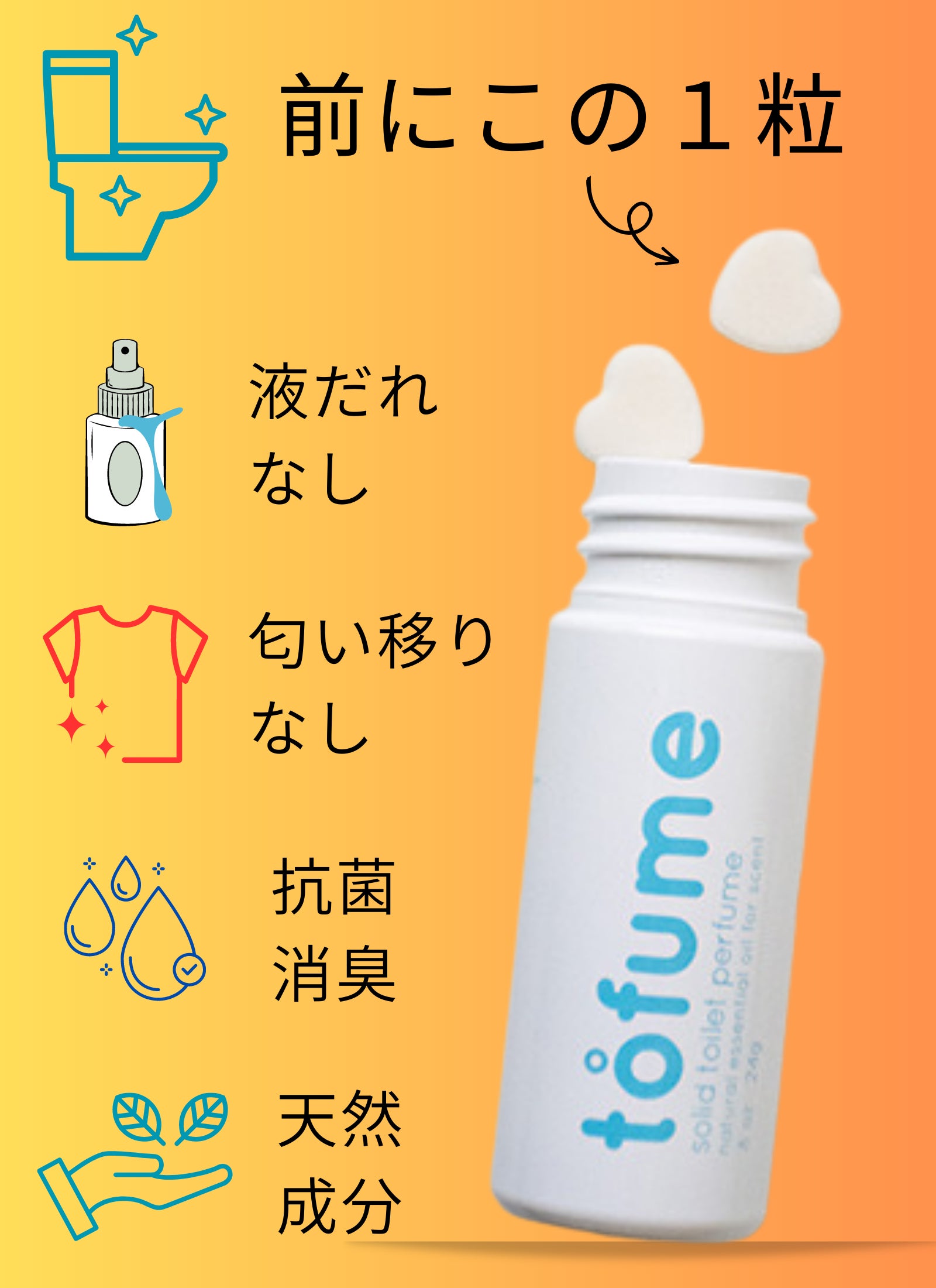 tofumeは錠剤タイプで重量たったの24g!!液だれなく、匂い漏れもない可愛い専用ボトルケース。タブレット(粒)だから、1回の目安がわかりやすく、使用前に便器内に投入する事で、スプレータイプと違い、空気中へ飛び散ったり、最後まで使い切れない不満も解消。