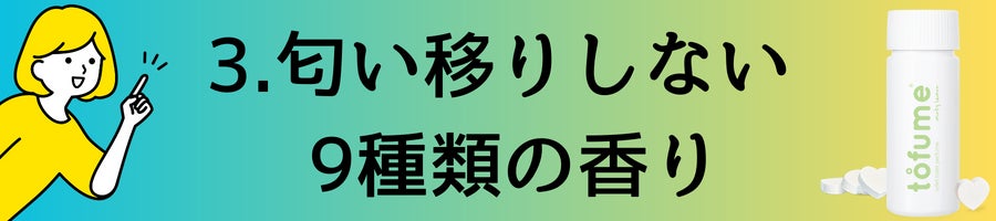 「ニオイを隠そうとすると強い香りになり、悪いニオイと混ざり合った不快なニオイになります。つまり、消臭と香りはセットで機能が理想的」tofumeは、しっかり消臭と爽やかな香りが同時機能し、服へのニオイ移りもありません。