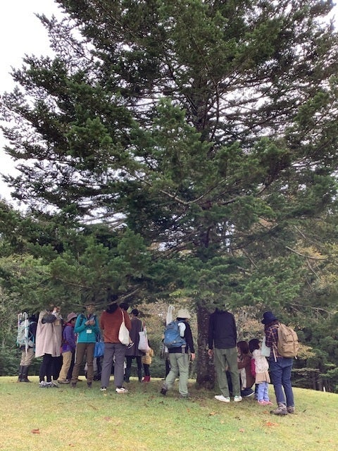 自己紹介をみんなでした後、芝生広場のもみの木にごあいさつ、葉っぱをニギニギするといい香りが手のひらに付きます。