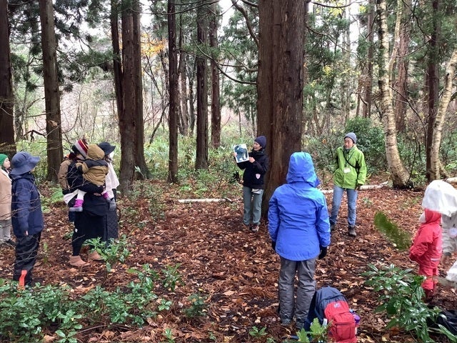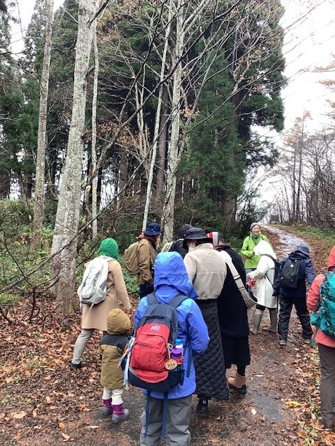 参加者で施設ヨコの「モチモチの木」トチノキの下に、落ち葉が集まっていたので踏み踏みしてからモミの木の香りを楽しんでから杉林の中へ、散策路から森へ入るときは冒険が始まる感じで、子どもも大人もちょっとテンションが上がります。