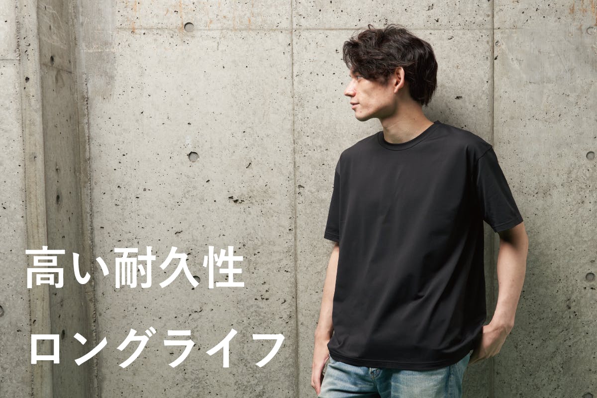 加えて素材の特性と高度な染色技術からくる高い染色堅牢度で、コットンTシャツのような「白化」も少なく、使い込んでも色褪せによるヘタリ感を軽減しています。長く美しい発色で着用いただける商品です。
