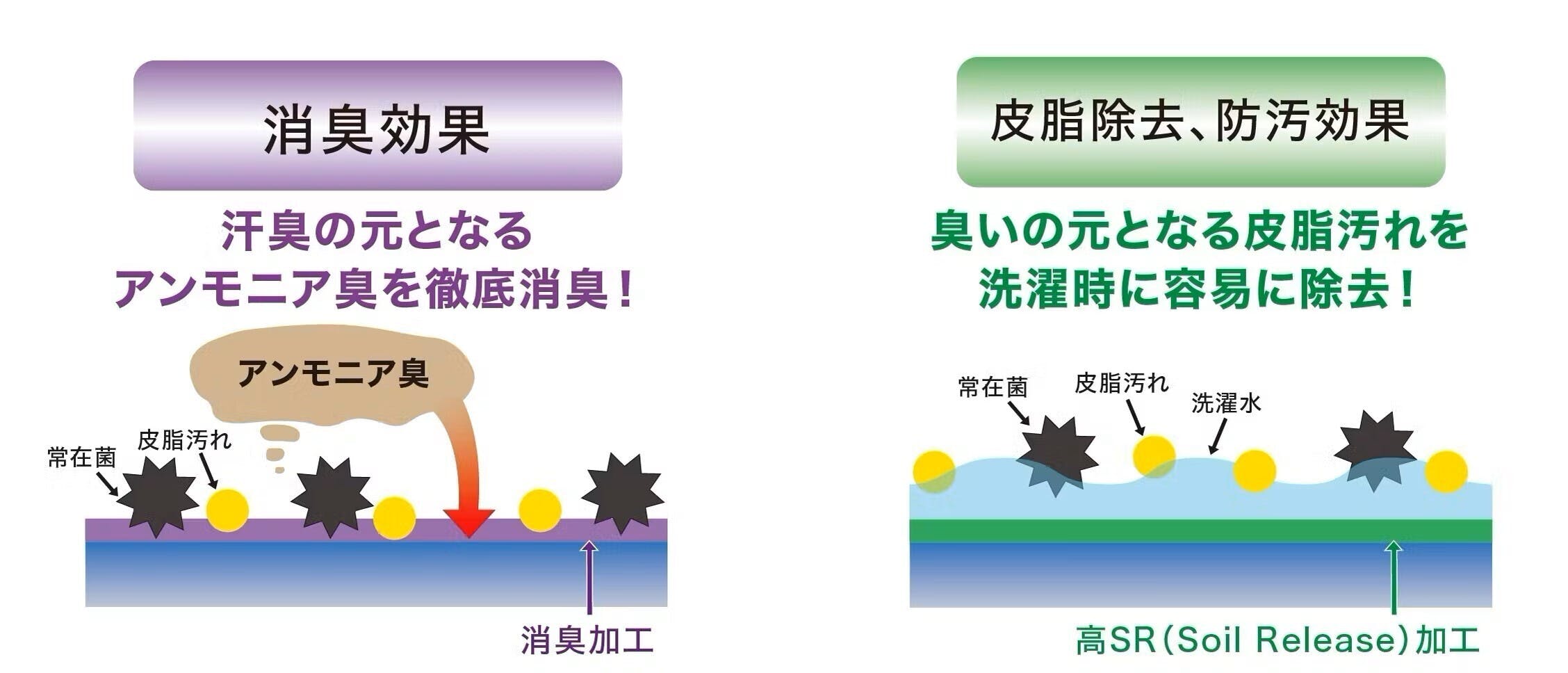 また、気になるニオイも、閉鎖された環境で洗濯なども簡単ではない宇宙空間でも快適であることを追求したJAXA・東レ共同開発の高レベル消臭技術で抑制。