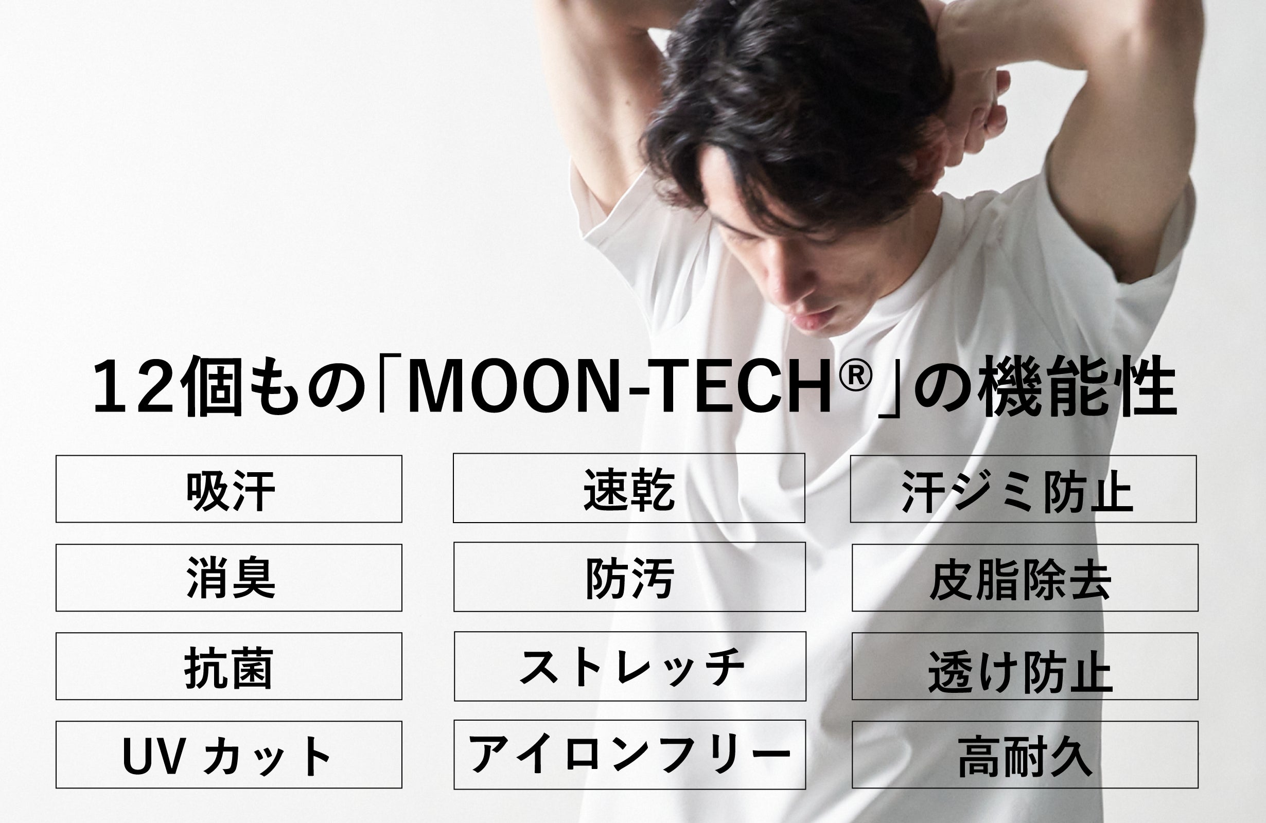「MOON-TECH®」は、特殊なスプリング状の繊維構造で高いストレッチ性を出す特殊原糸をTシャツのすべてのパーツに贅沢に使用しています。
