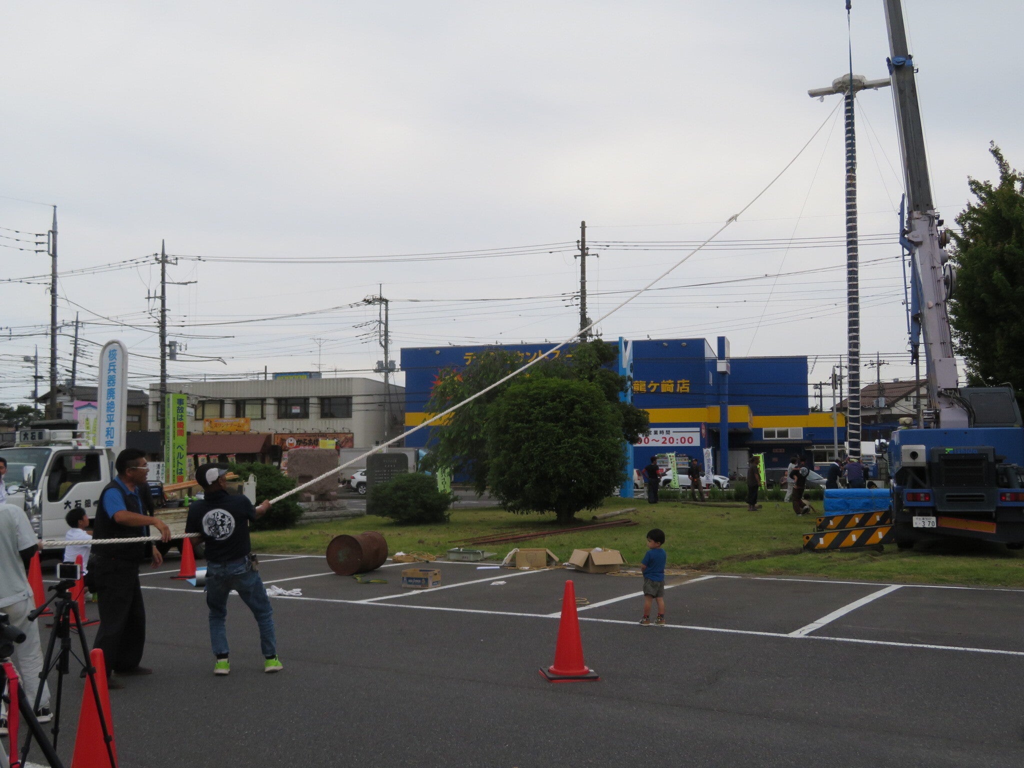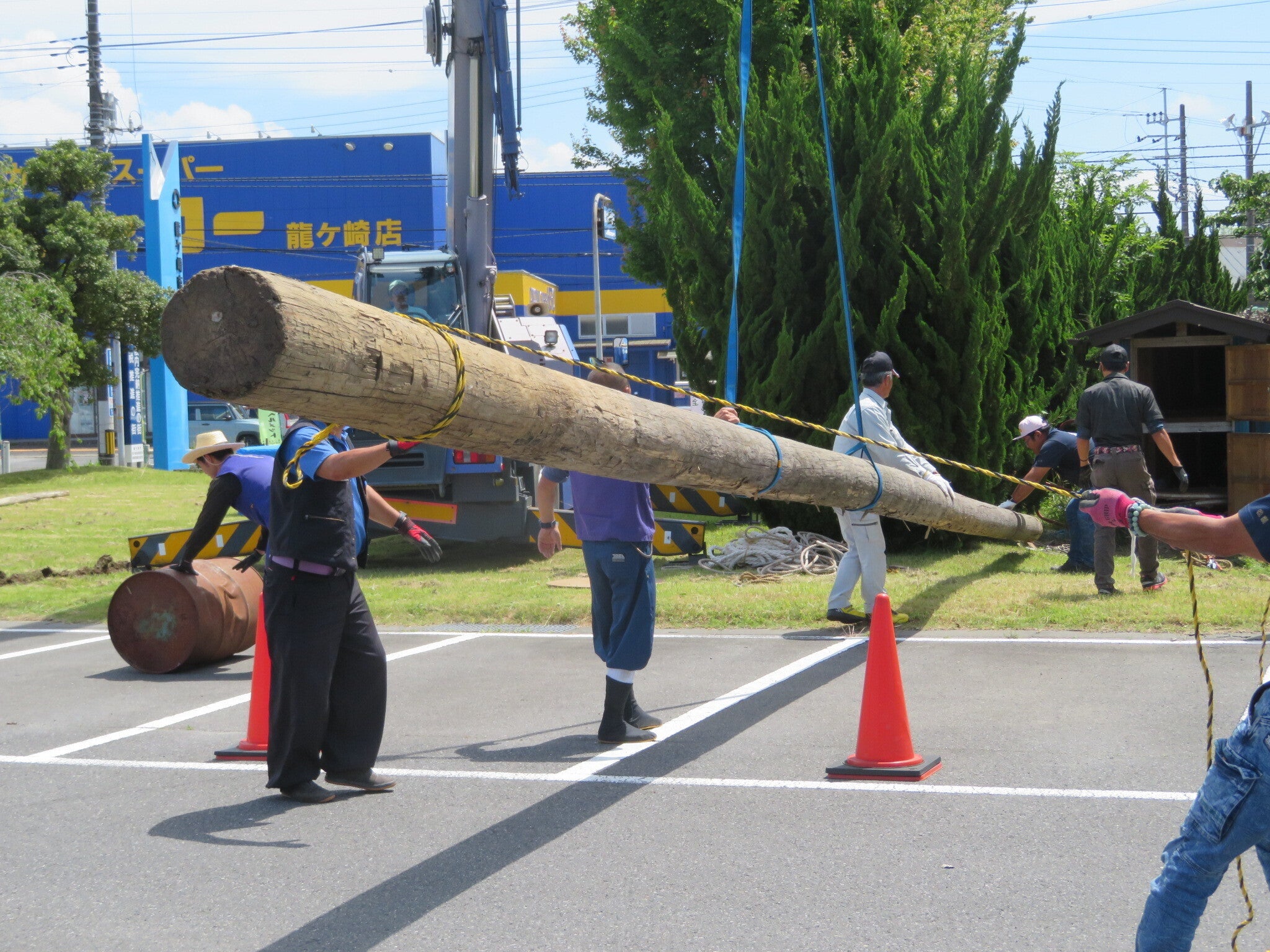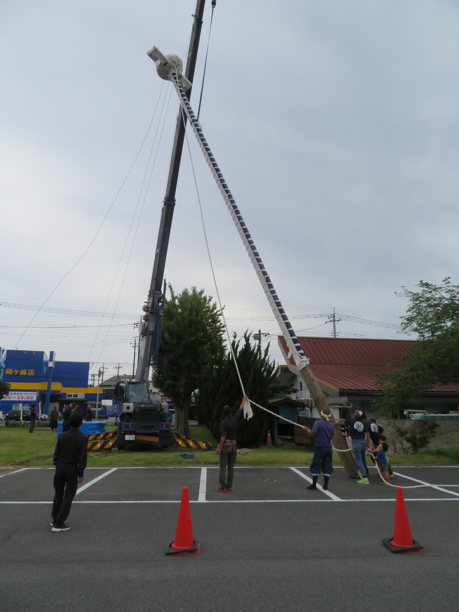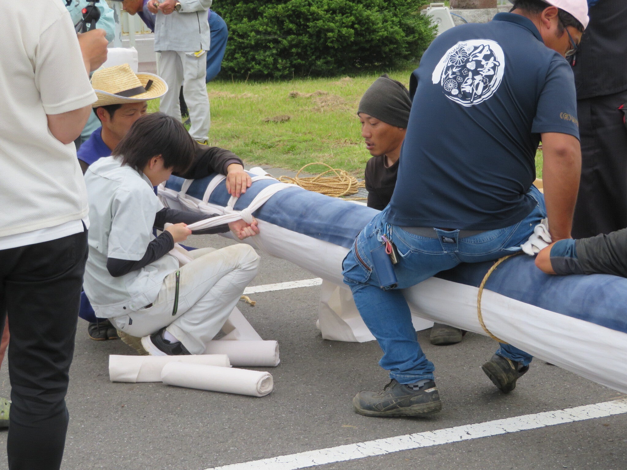7.布で覆われた龍の胴体を表現した撞柱をクレーンを使って立てます。