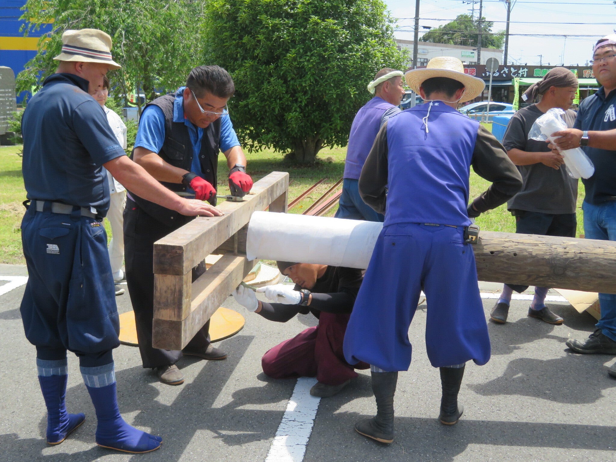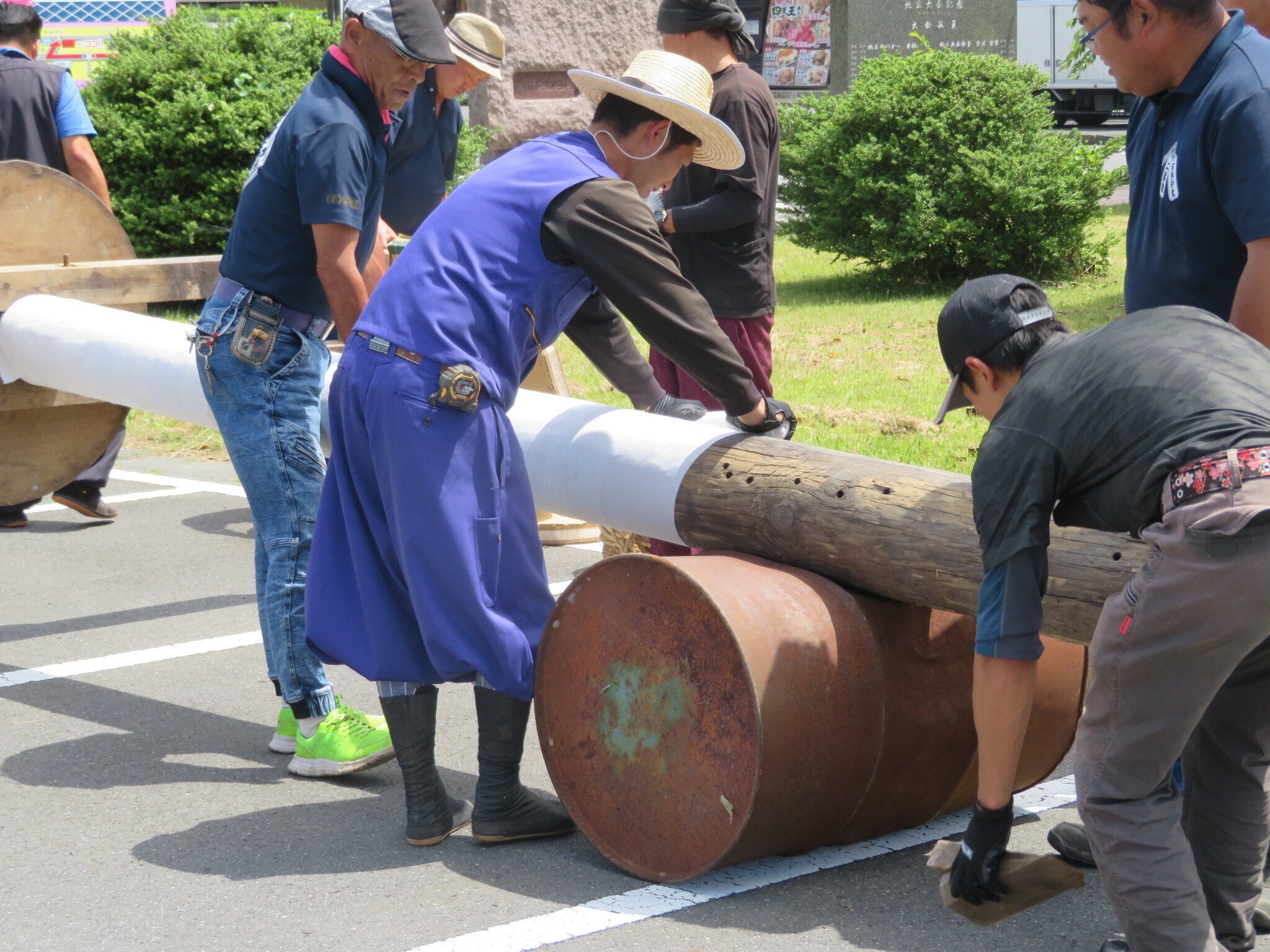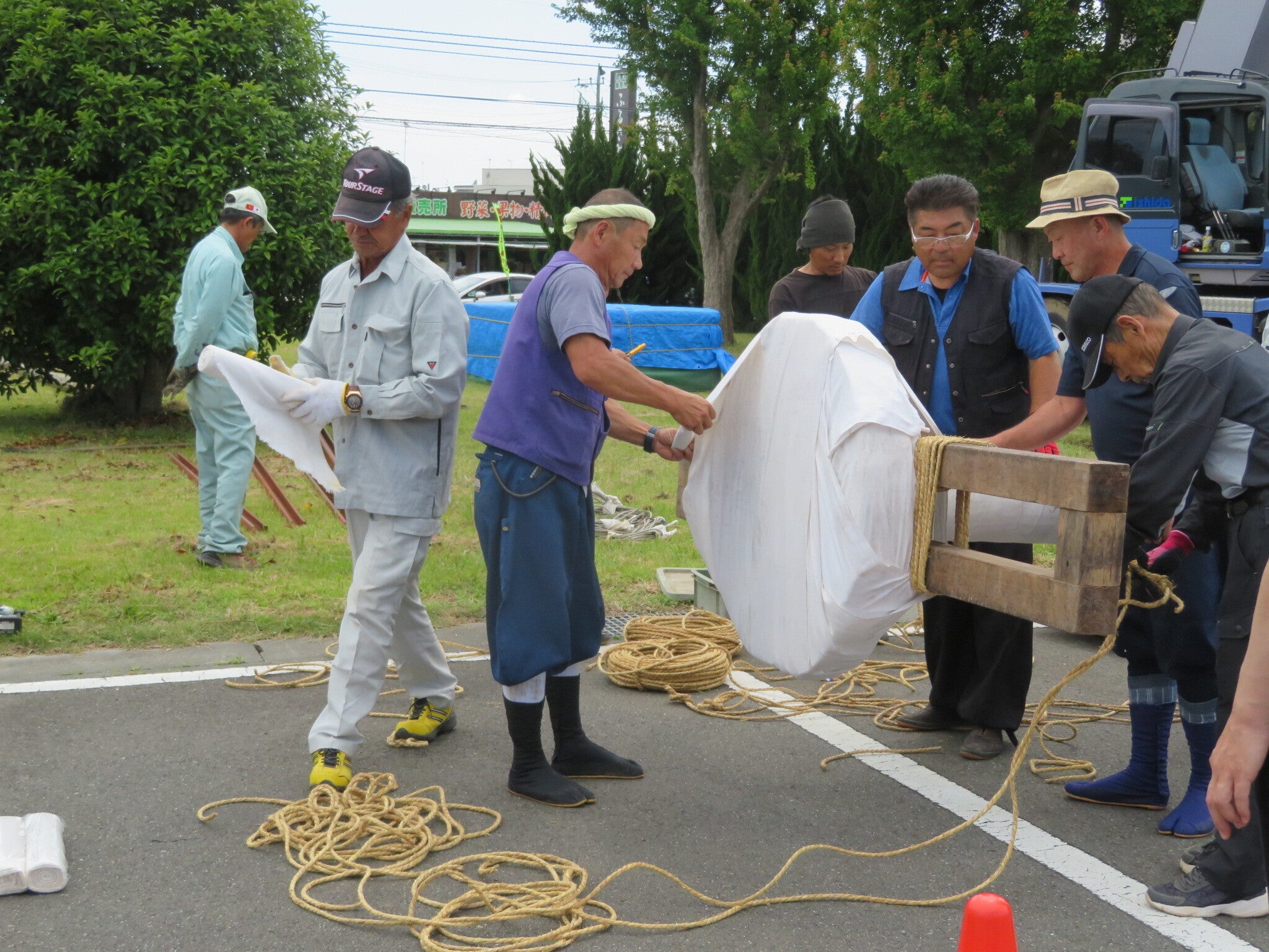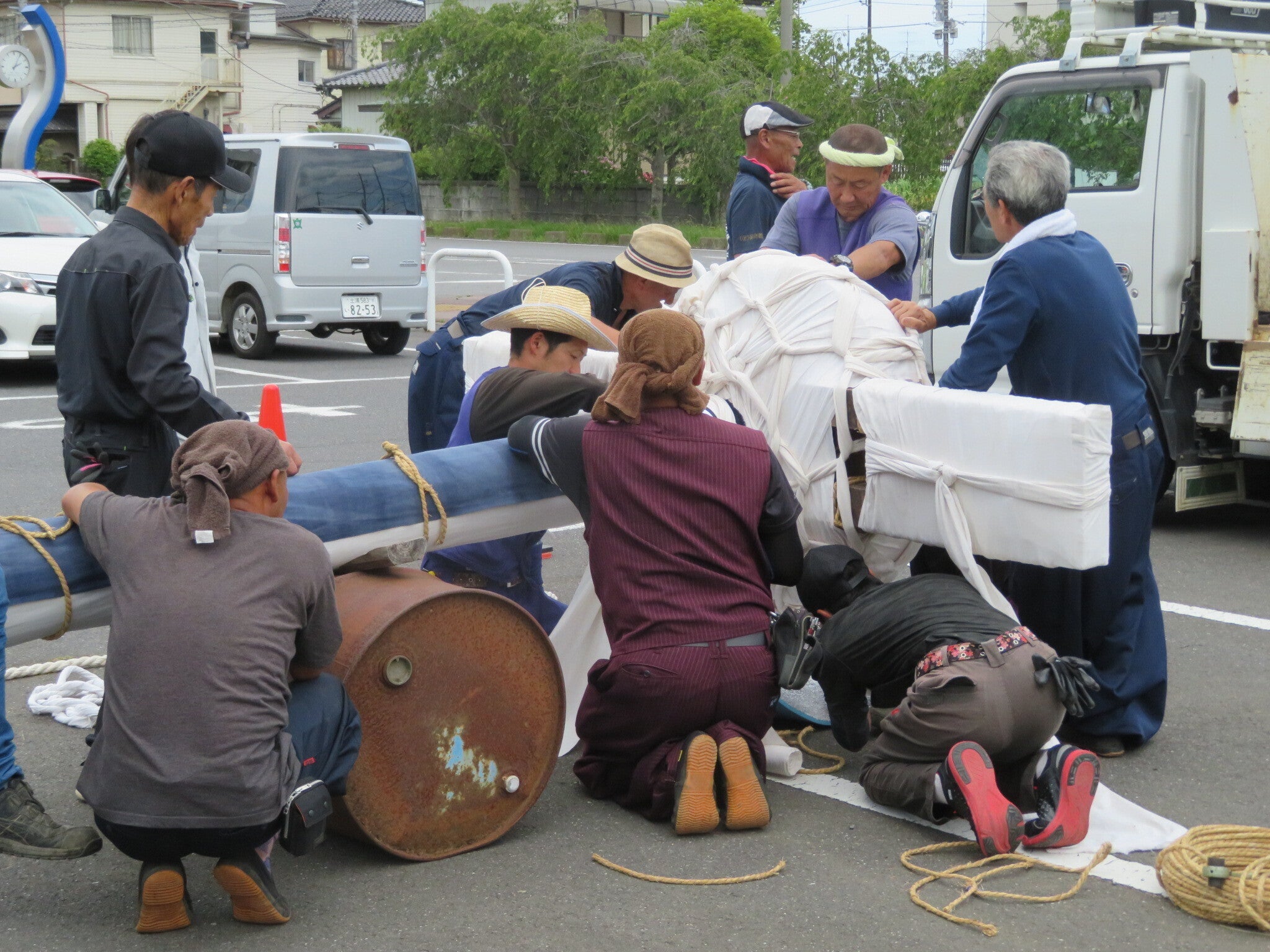 7.布で覆われた龍の胴体を表現した撞柱をクレーンを使って立てます。
