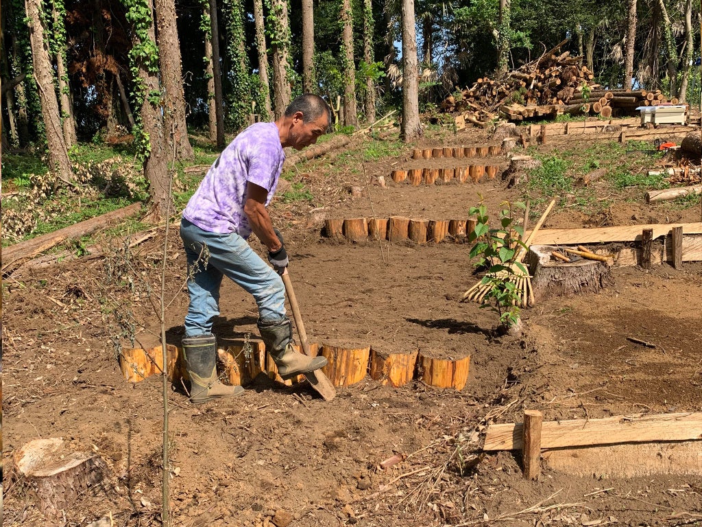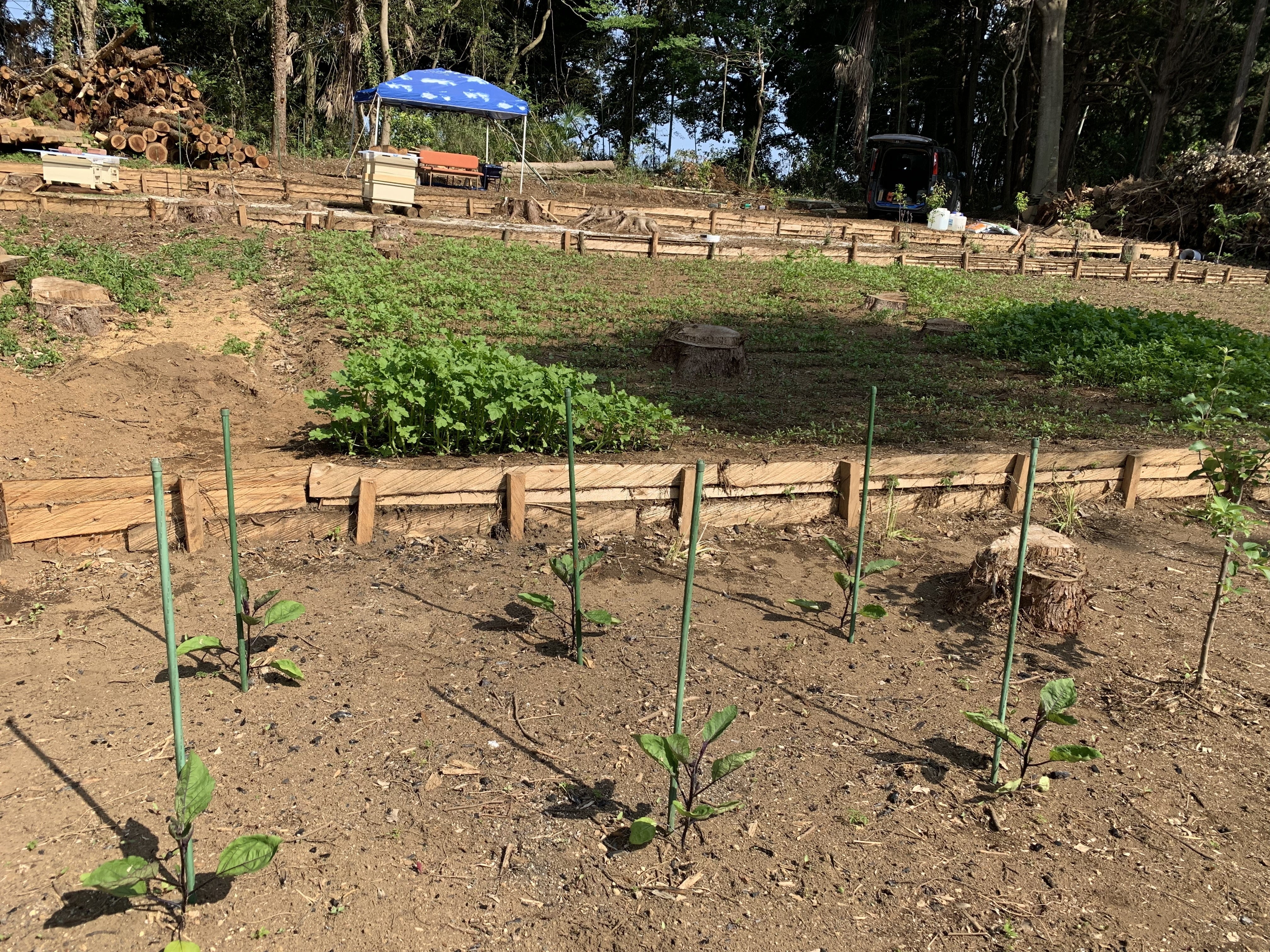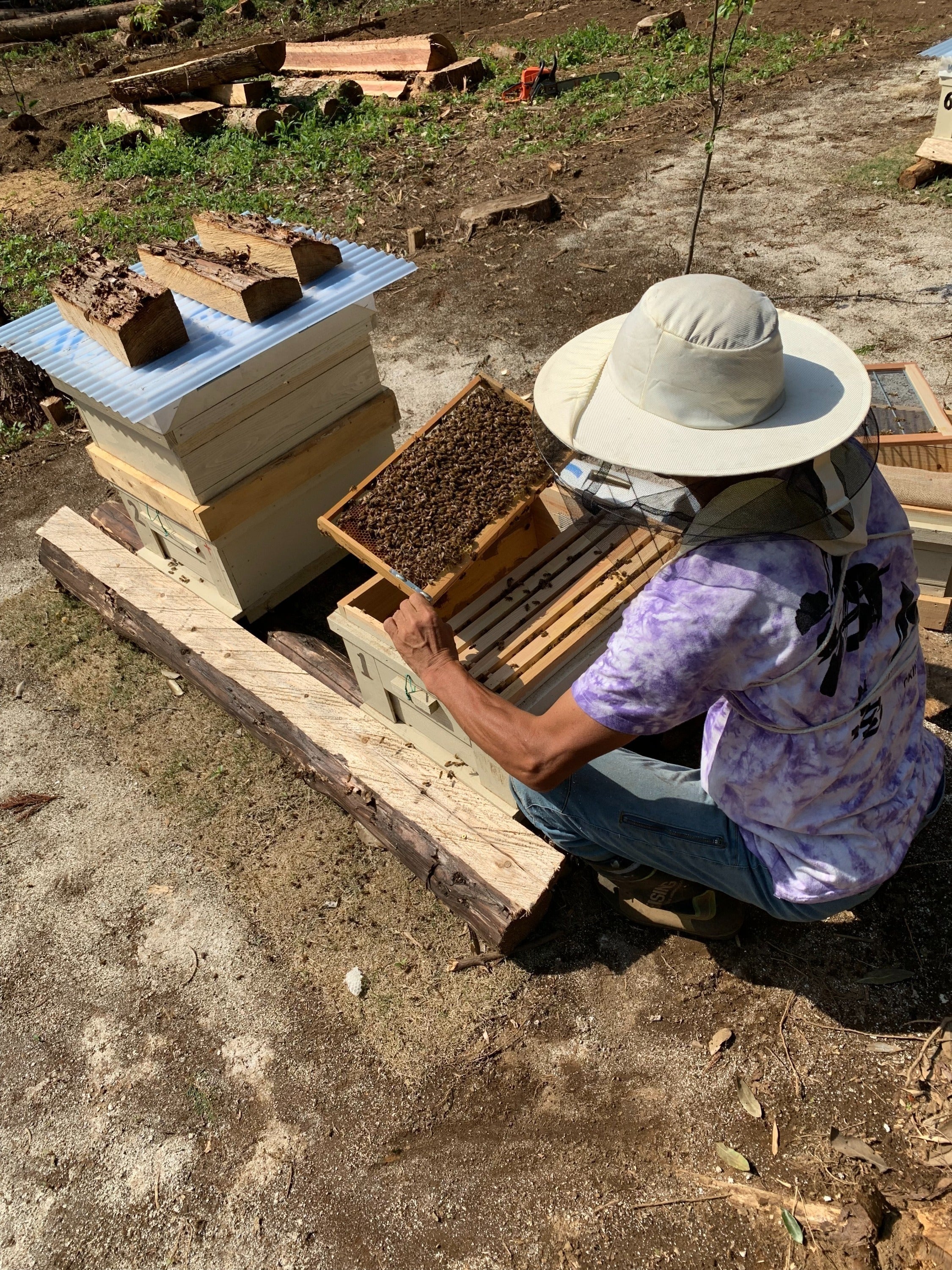 昨年、今まで営んでいました飲食店はコロナの影響の事もあり、やむを得ず閉店し、茨城県鉾田市に移住しました。近くの知人の土地(杉の森、約1200坪)を借り、現在、一人で伐採からはじめ、土地を耕し花の種を蒔いて、蜜源になる果樹や木を植えるなど、毎日養蜂場造成に汗をかいております。今の時点で、約400坪ほど伐採し、蜜蜂を飼育できるように造成し、現在6群の西洋蜜蜂の飼育を始めました。