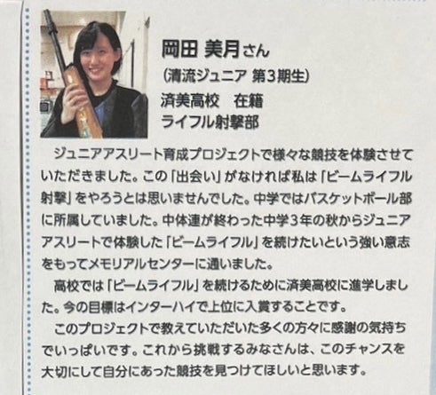 いつもお母さんから、美月さんの活躍を聞いています。ライフル射撃は、美月さんのお母さんから聞くまで、あまり知りませんでした。国体3位の活躍を聞いてとても嬉しく思います。色々な人にライフル射撃を知っていただけるといいですね。ぜひ、皆様も美月さんの応援よろしくお願いします。