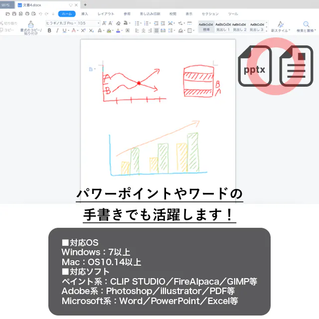 illustrator、Photoshopなどのクリエイティブな創作活動から、テレワークのオンライン会議でのホワイトボードツールまで、各方面で大活躍間違いなしです!