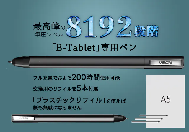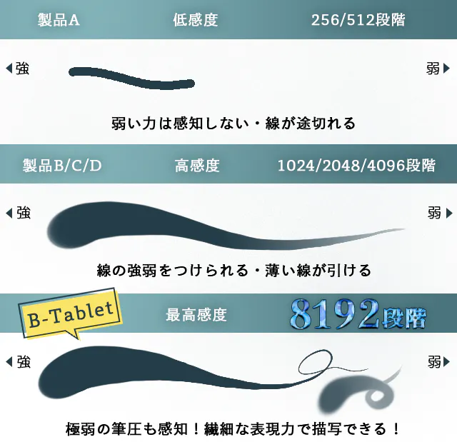 "B-Tablet"に付属している専用ペンは、筆圧を8192段階で感知し、あなたの意図した繊細なタッチを正確に再現可能です。