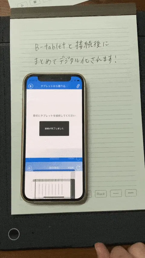 スマホやタブレットで専用アプリを開き、Bluetoothで"B-Tablet"と接続した状態で専用ペンで手書きすると、書いた内容をリアルタイムでデジタル化します。