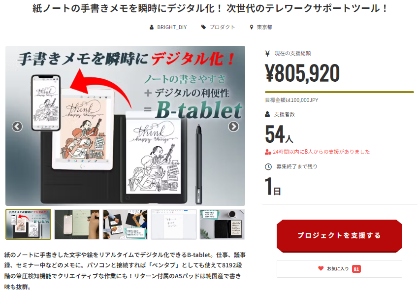 プロジェクト終了後、「紙ノートの手書きメモを瞬時にデジタル化! 次世代のテレワークサポートツール!B-Tablet」をmachi-ya特別価格で入手することはできなくなりますので、ご支援がまだの方、追加支援をご検討の方はお急ぎくださいますようお願い申し上げます。