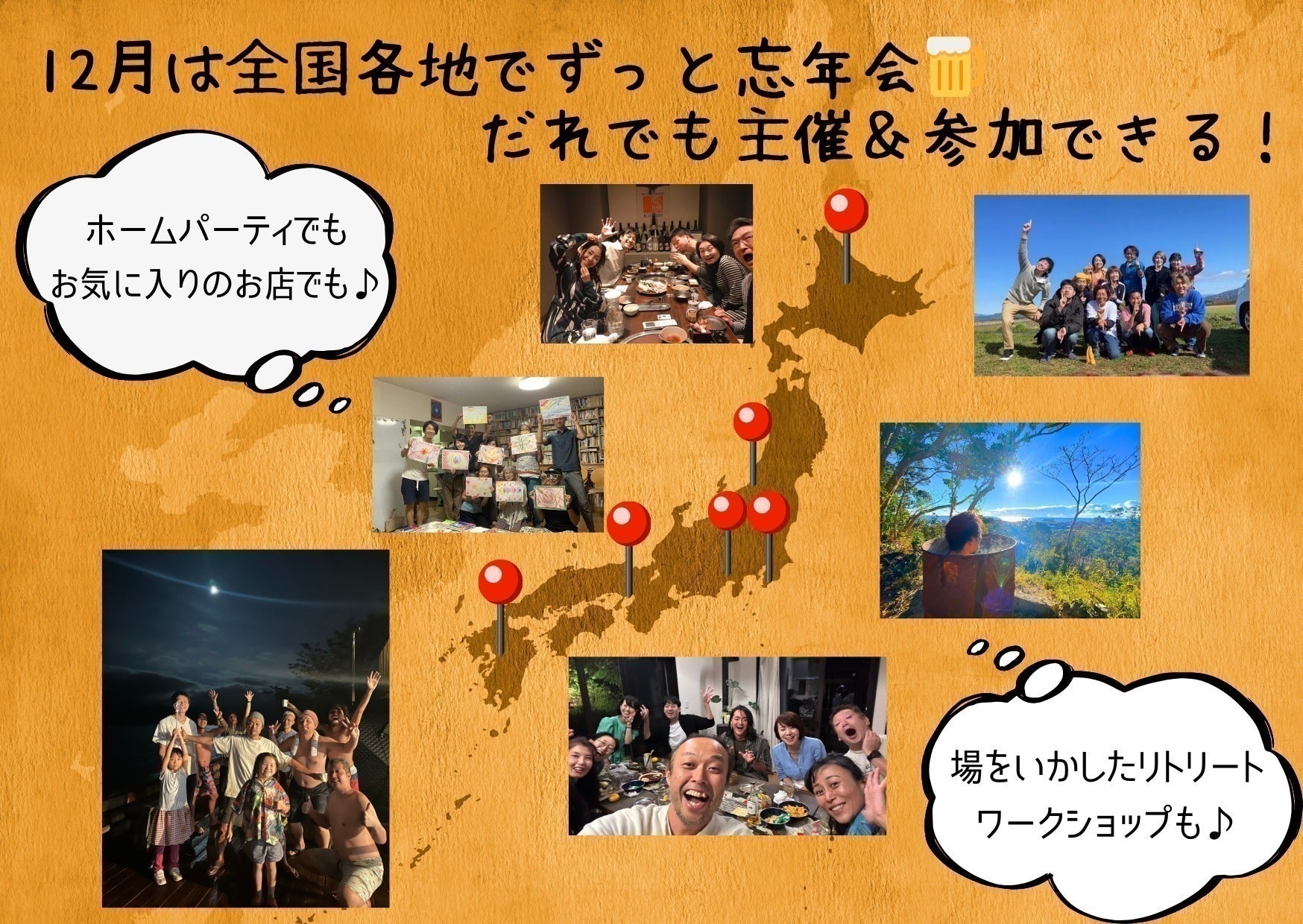 ①全国各地で「シン時代」の願いを語らう忘年会を開催する