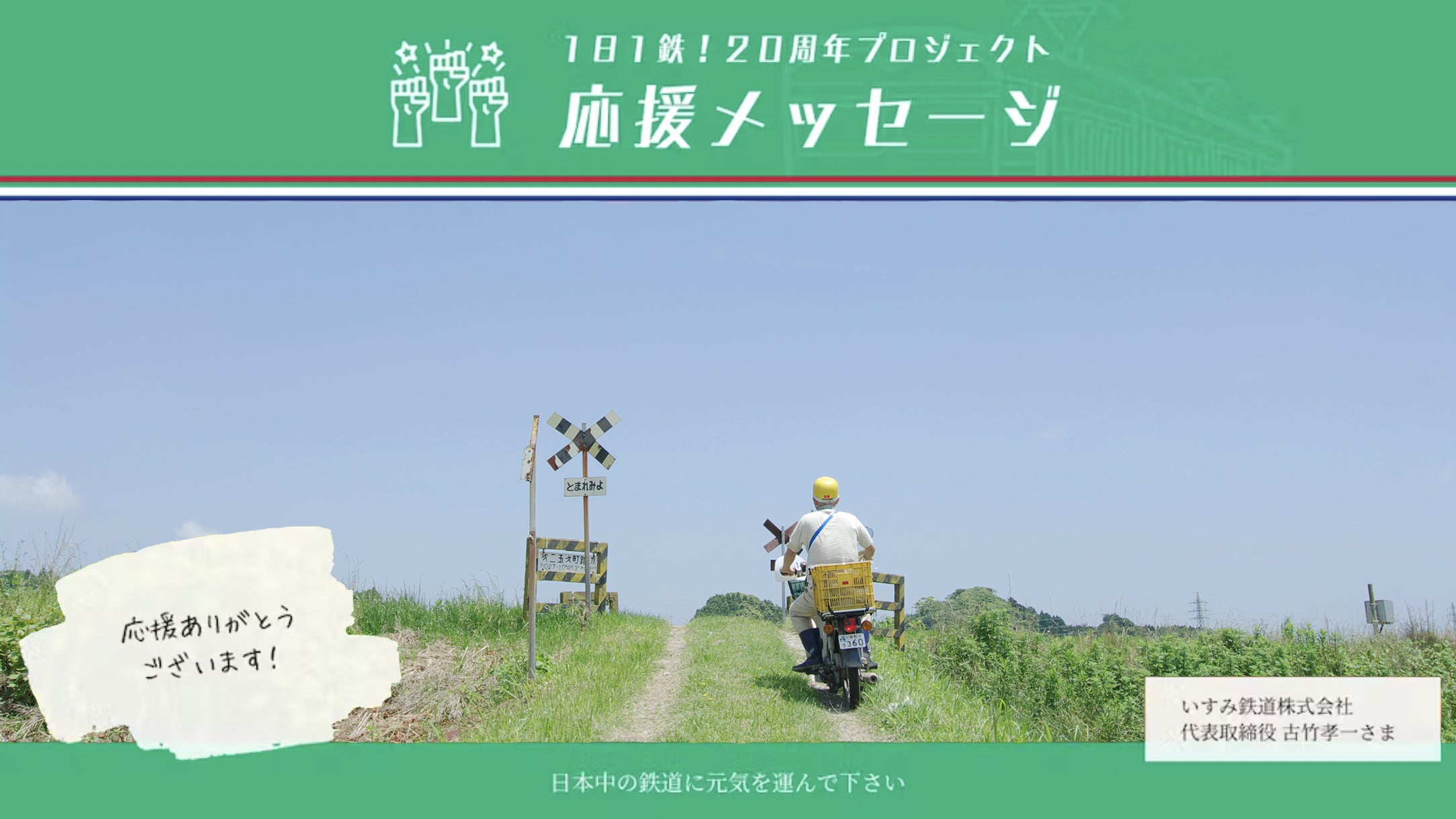 中井精也さま1日1鉄!20周年おめでとうございます。中井先生との出会いは、私がいすみ鉄道社長に就任して、まだ業界の事がわからない2018年11月に荒川での「ゆる鉄画廊」にお邪魔したのがきっかけで現在もお付き合いさせて頂いております。鉄道業界は色々ファン層が太く、また多方面におられますが、中井先生はいつも笑顔で接しており、本当にすごいなと感心しております。我々の会社は「第二五之町踏切」という素敵な場所を先生の作品で有名にしてもらい、本当に全社員が頭下げなければ叱られる状態でして、切っても切れない関係です。ローカル鉄道まだまだ大変な局面がありそうですが、どうぞこれからも我々を見捨てず、鉄道写真を通じて、美しさや重要性を捉え続ける作品をたくさん世に送り出して頂き、日本中の鉄道に元気を運んで下さい。これからもお互い元気で走り続けられるように我々も頑張りますので、今後ともよろしくお願いいたします。いすみ鉄道株式会社代表取締役 古竹孝一 様 よりーーー心強い応援の言葉、ありがとうございます。最後まで諦めず、皆様と共に進んでいきます。