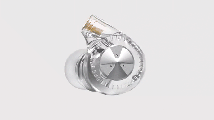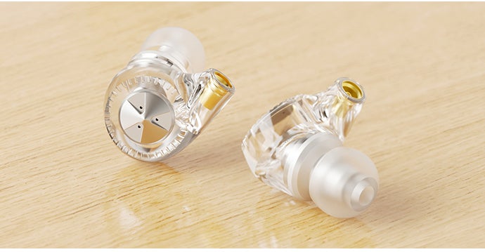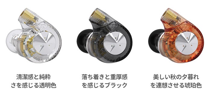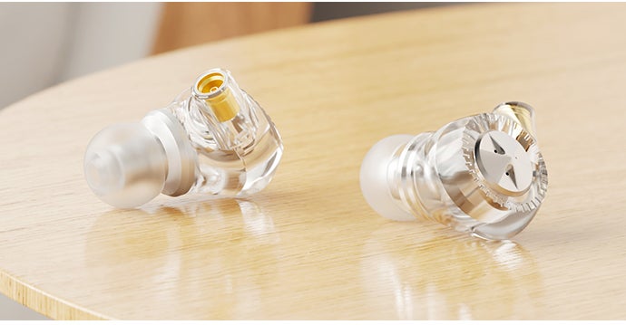 「CF5-1」のイヤホンの特徴の一つは、まるでクリスタルのように透き通った外観です。ボディの中央には美しく磨かれた金属パーツが使われ、金属色とクリスタルのような輝きが合わさって、洗練された雰囲気を演出しています。高級感が溢れる美しい見た目です。