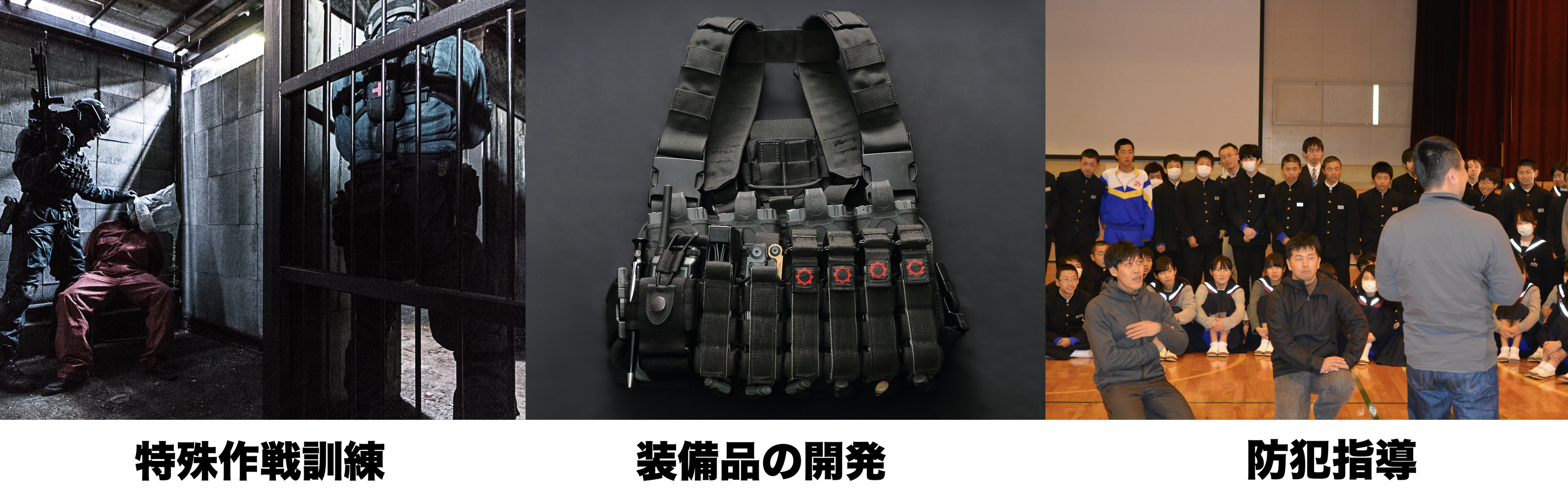 社員には警察・自衛隊の元特殊部隊が複数在籍しており、その経験を活かした戦闘職種の装備品開発・技術講習が主たる業務であり、今まで延べ1万人以上の警察・自衛官等その道のプロへ専門的なスキルを提供してまいりました。