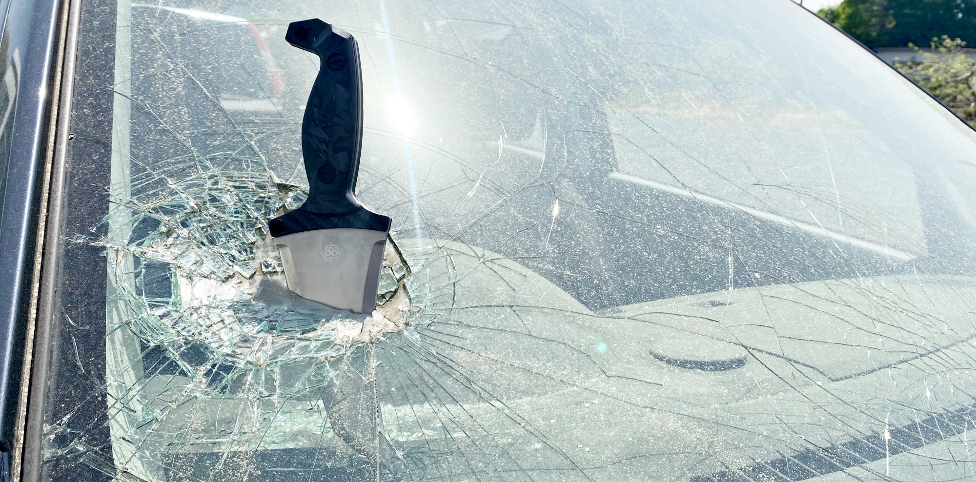 次に、フロントガラスを何度も突き刺し・斬る等のハードな試験も行いましたが、若干のポイントの丸まりと刃こぼれがある位で、ブレードは一切歪むこと無く、研ぎで簡単に復活する程度の損傷しかありませんでした。