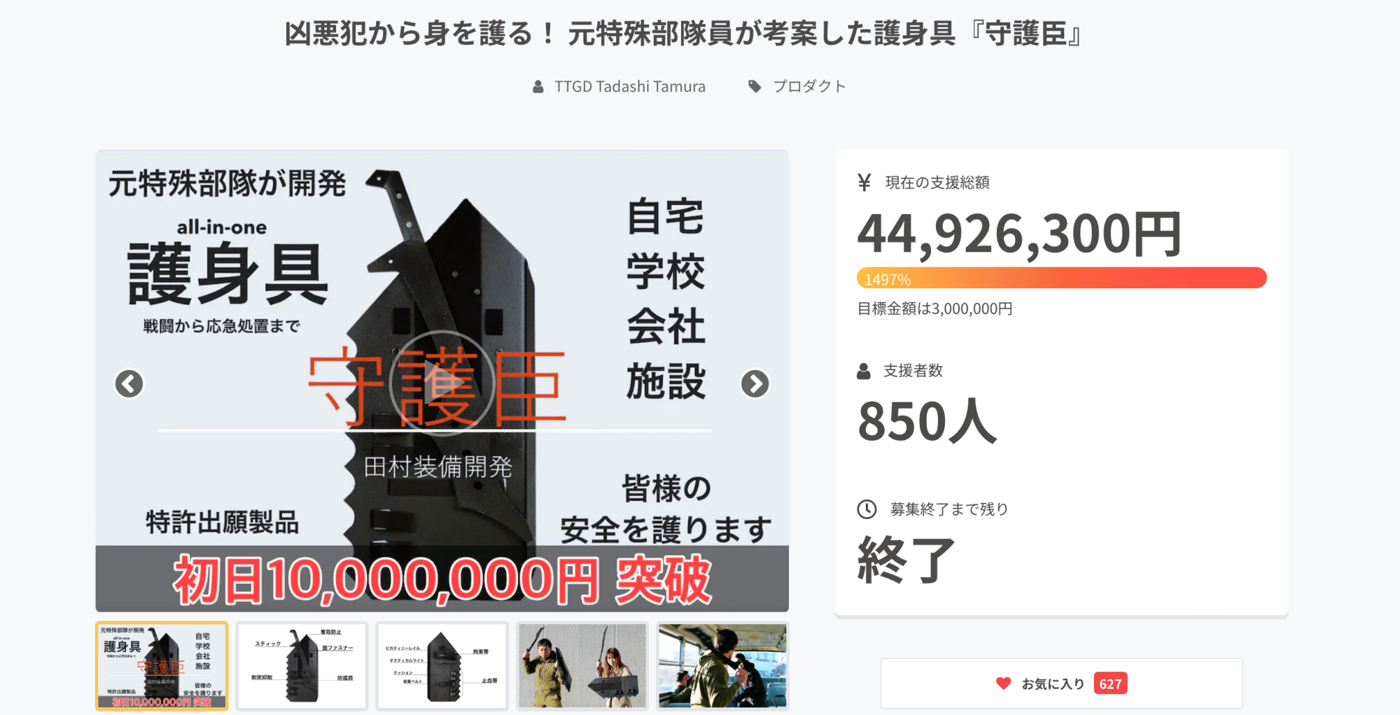CAMPFIREでのチャレンジは今回で2回目であり、前回のプロジェクト『守護臣(護身具)』では数多くの方がご賛同くださり、目標金額を大幅に超える4,492万円のご支援を賜りました。この場を借りて改めて厚くお礼申し上げます。ありがとうございました。