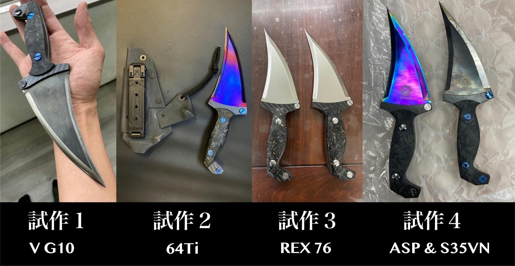 試作1と試作2は形状確認のために私がデザインし制作したもので、それ以降は刃物業者に依頼して様々な鋼材でテスト品を作制作してまいりました。
