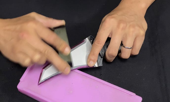 使用方法は刃物を固定して、砥石を手に持ち角度を均一に研ぎ上げます。(慣れないうちはマジックで刃の部分に色を付けて研ぐと直ぐに上手になります)