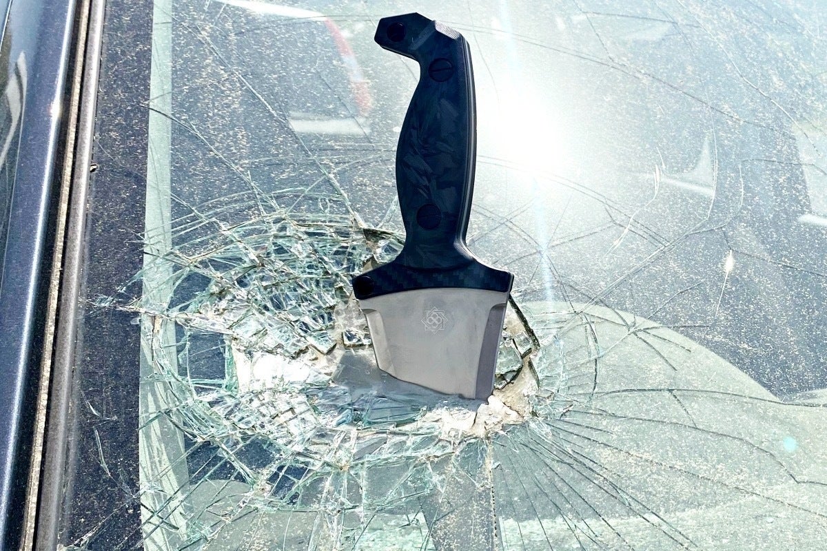 次に、フロントガラスを何度も突き刺し・斬る等のハードな試験も行いましたが、若干のポイントの丸まりと刃こぼれがある位で、ブレードは一切歪むこと無く、研ぎで簡単に復活する程度の損傷しかありませんでした。