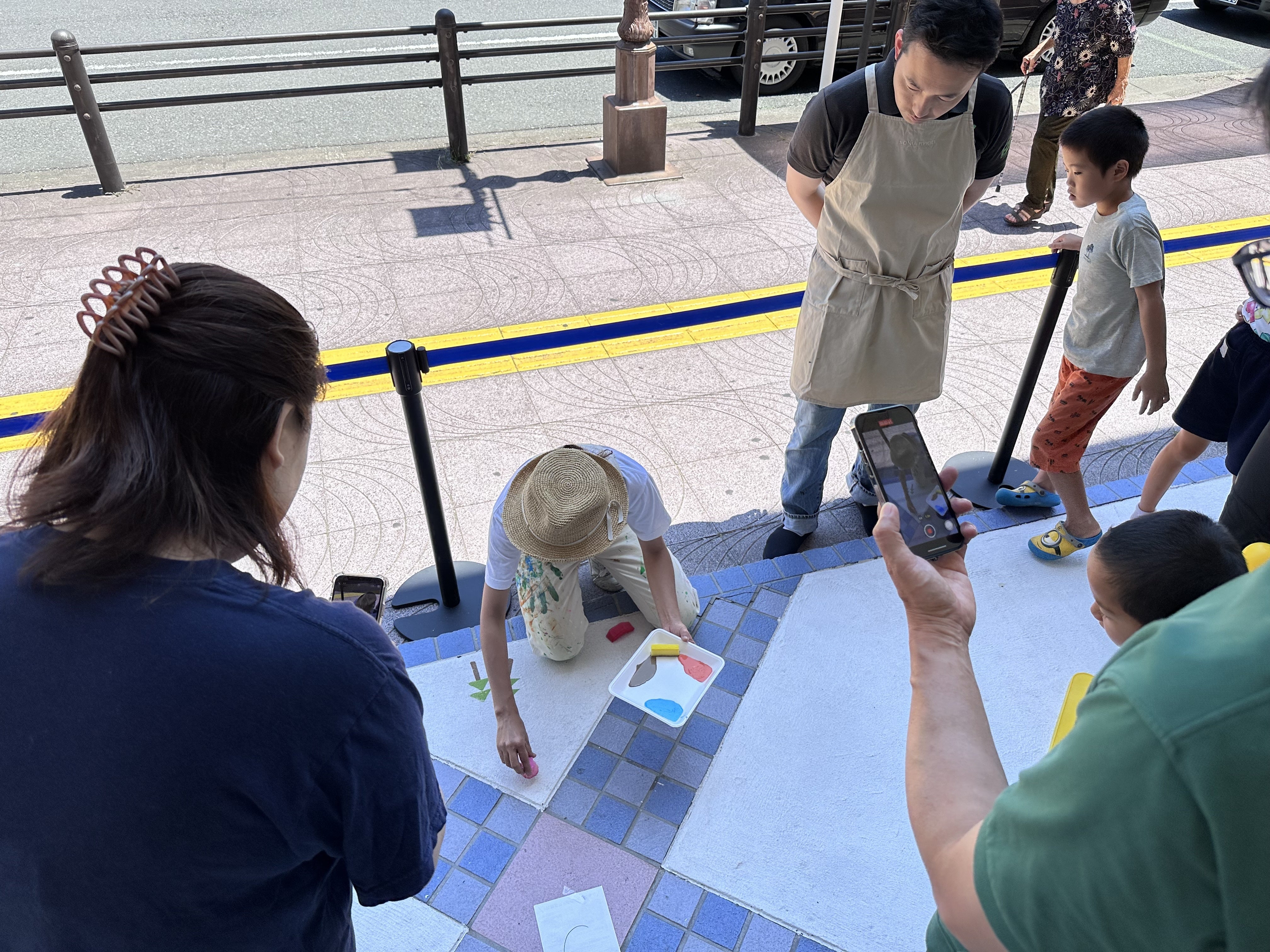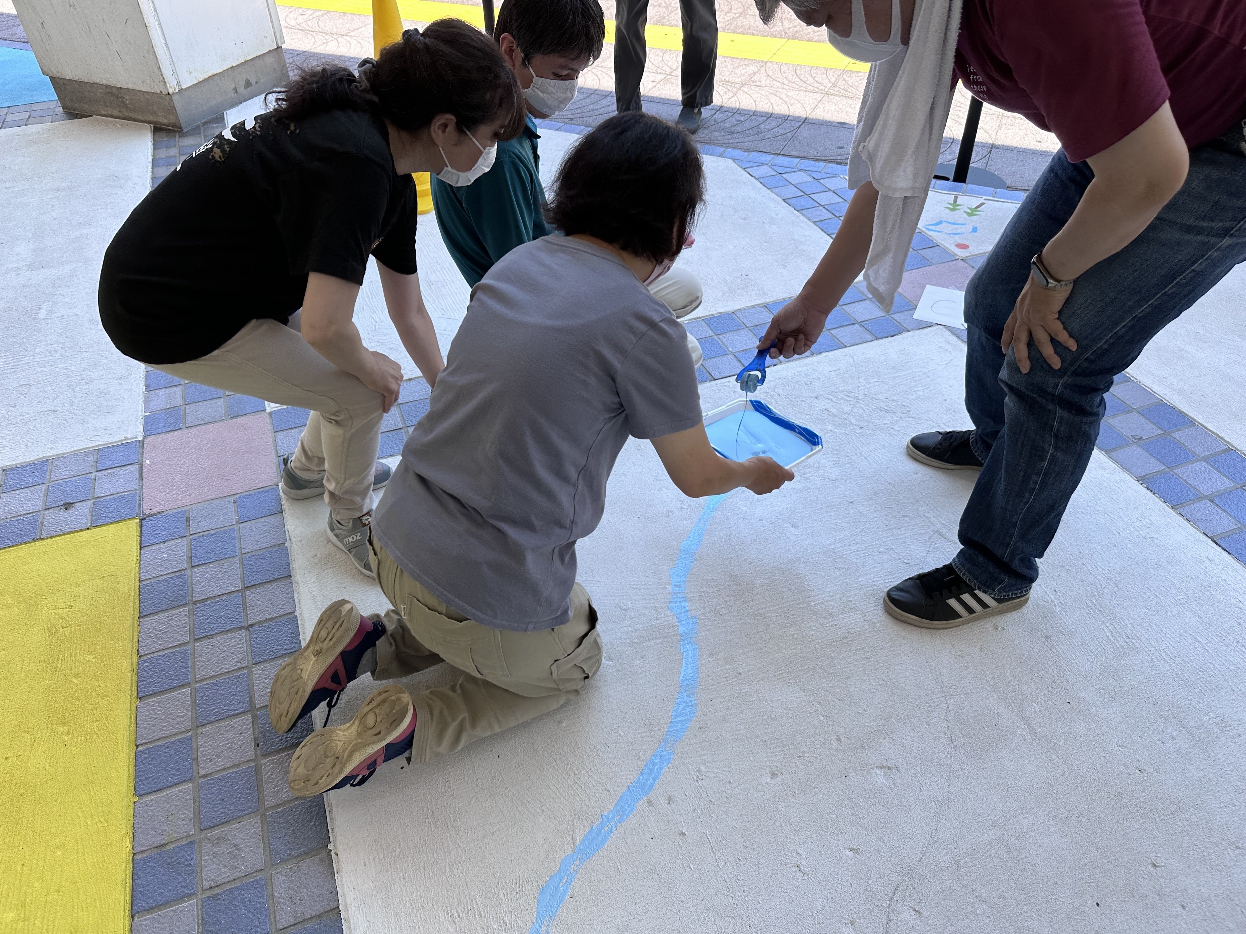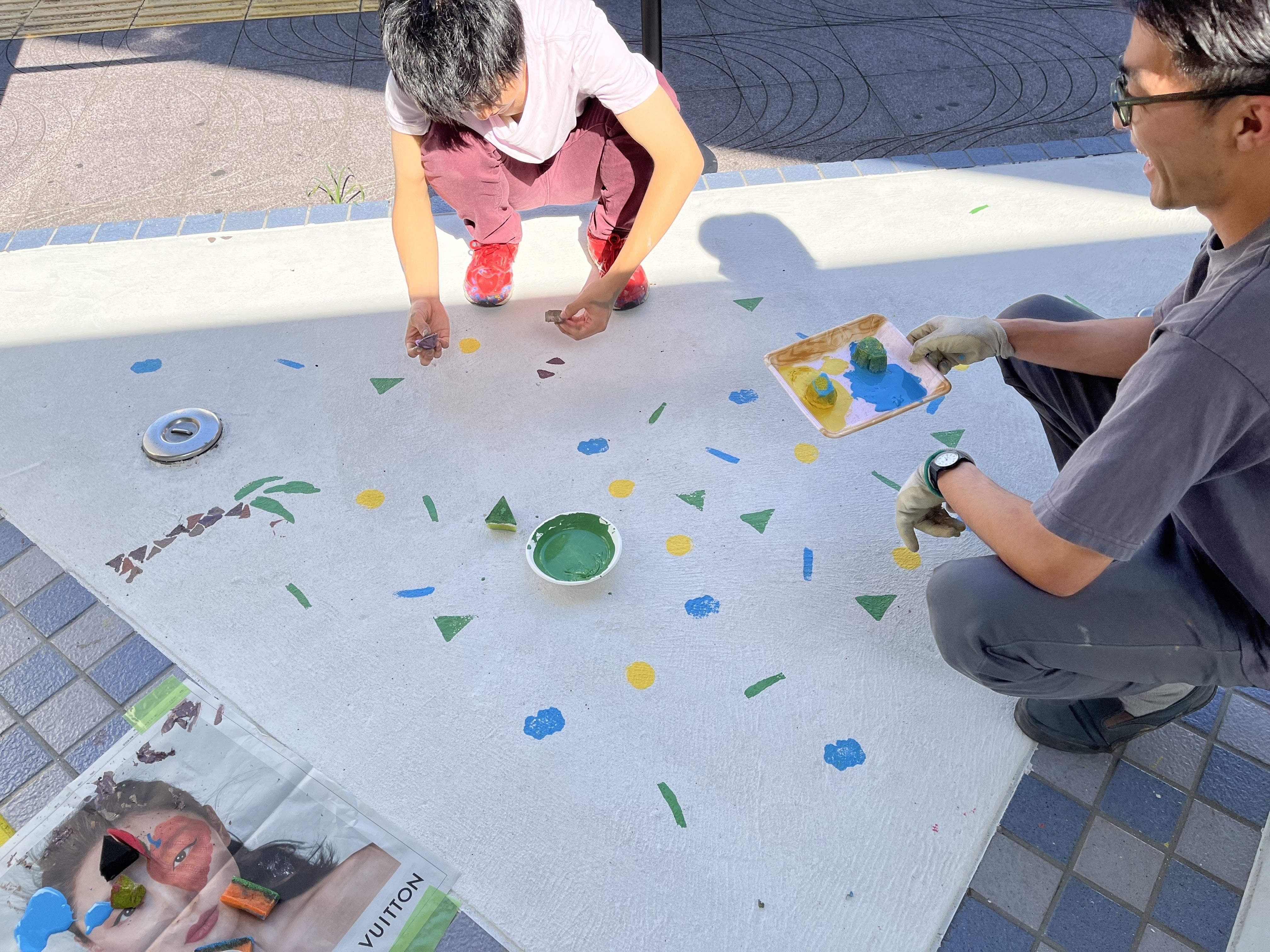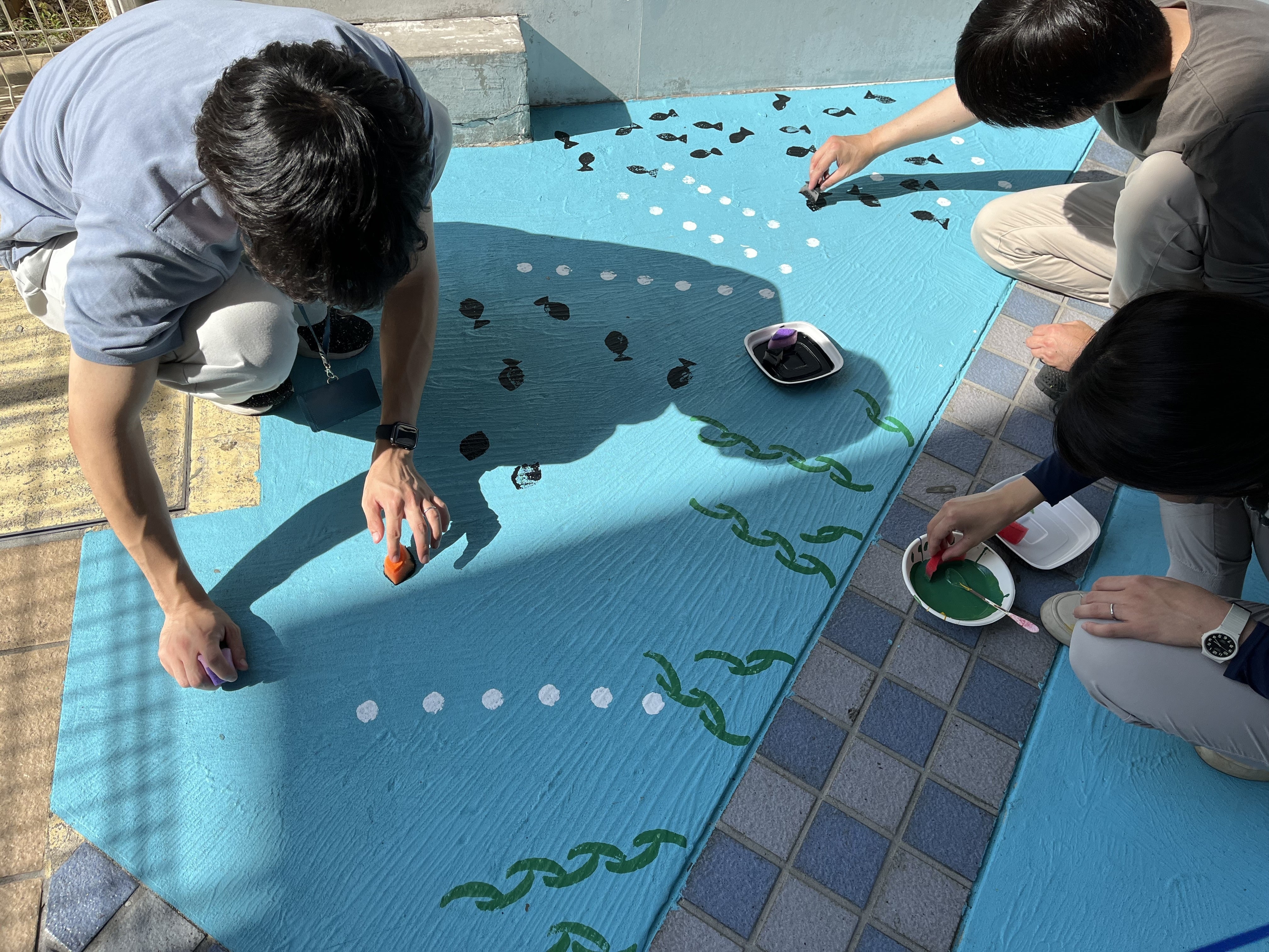 当日は画家のikuiroさん指導のもと、4グループに分かれて、それぞれがデザインをゼロから考えました。スポンジを様々な形に切ってスタンプを作り、青赤黄そして白のペンキを混ぜて色を作り、真っ白な床の上に押してしていきます。