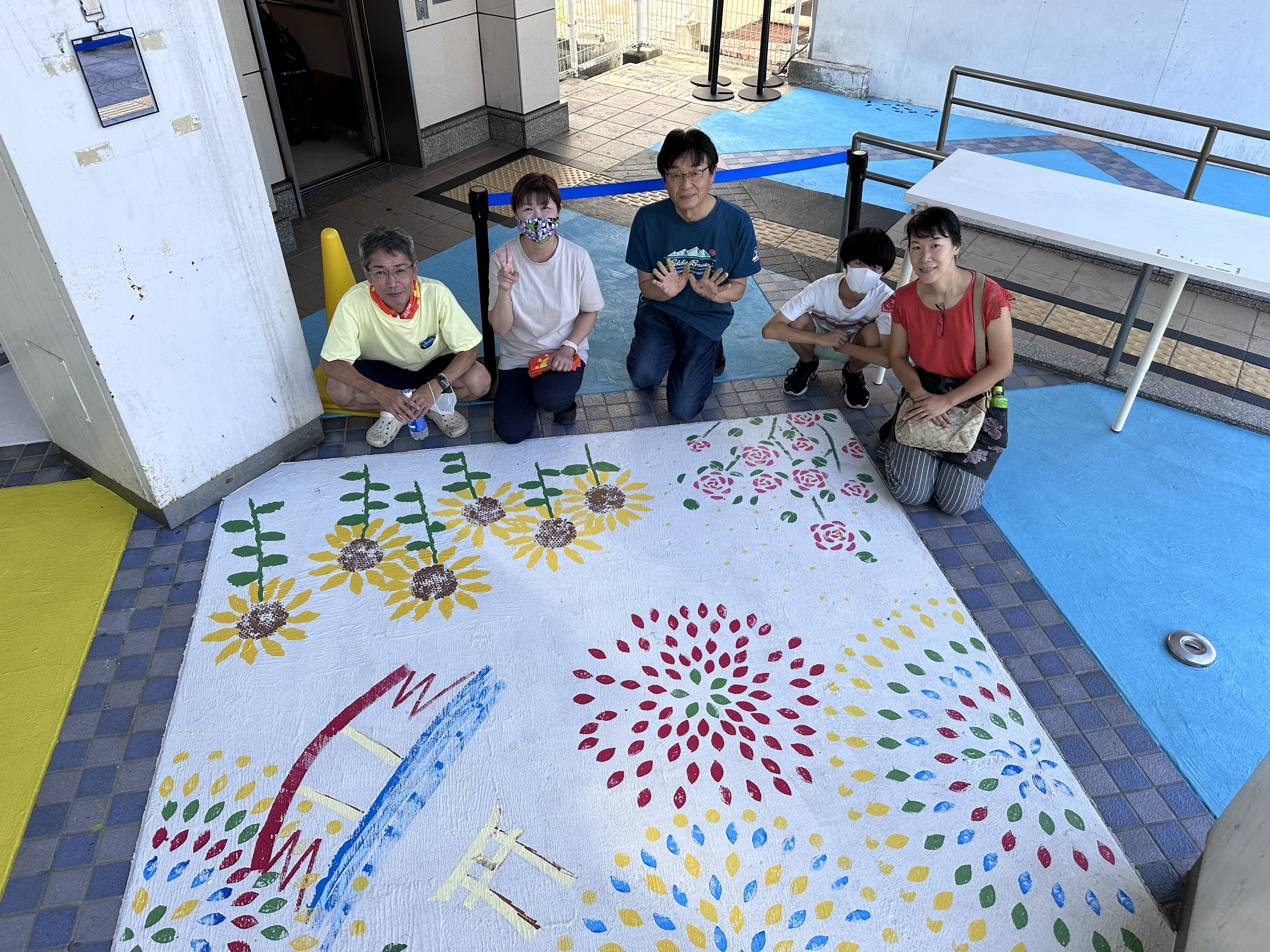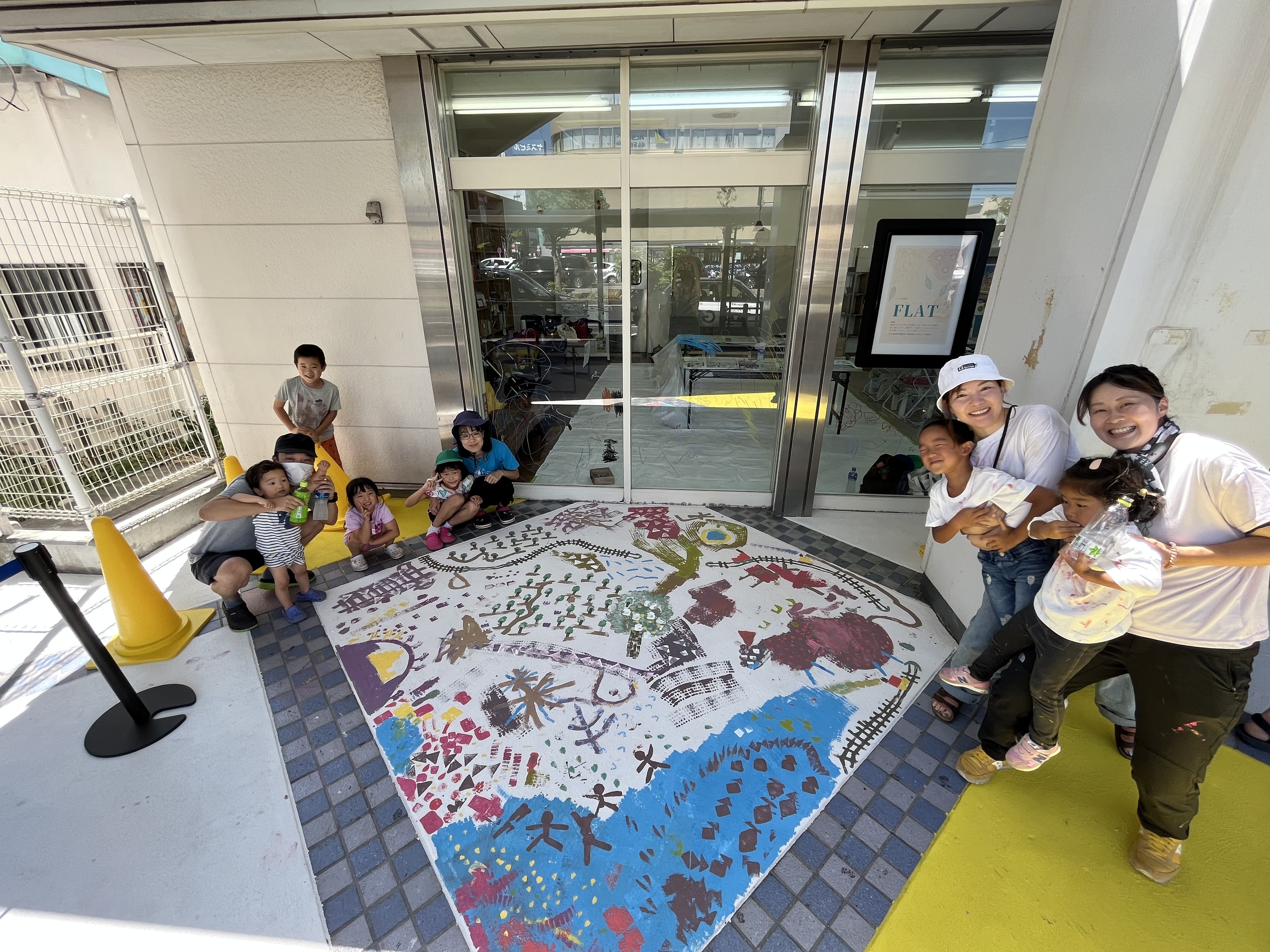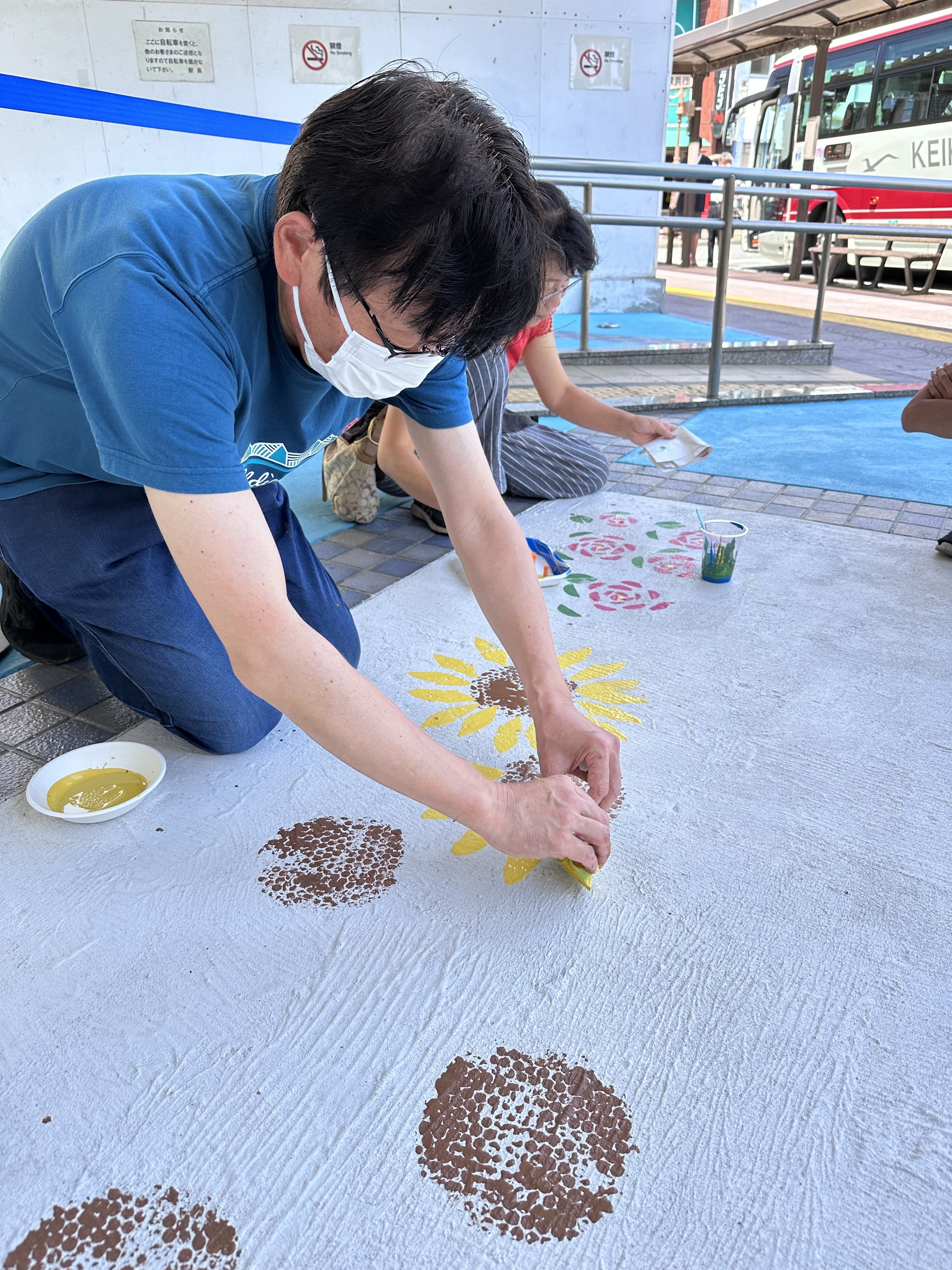 当日は画家のikuiroさん指導のもと、4グループに分かれて、それぞれがデザインをゼロから考えました。スポンジを様々な形に切ってスタンプを作り、青赤黄そして白のペンキを混ぜて色を作り、真っ白な床の上に押してしていきます。