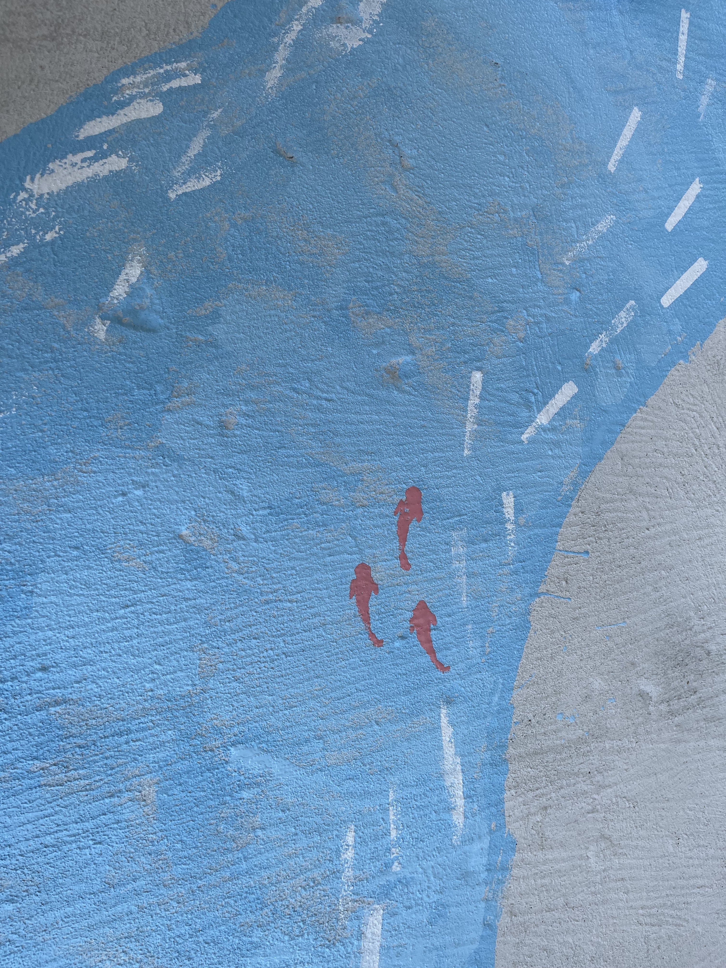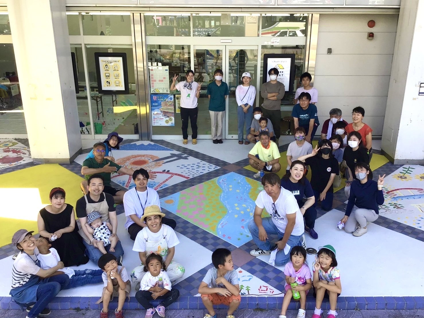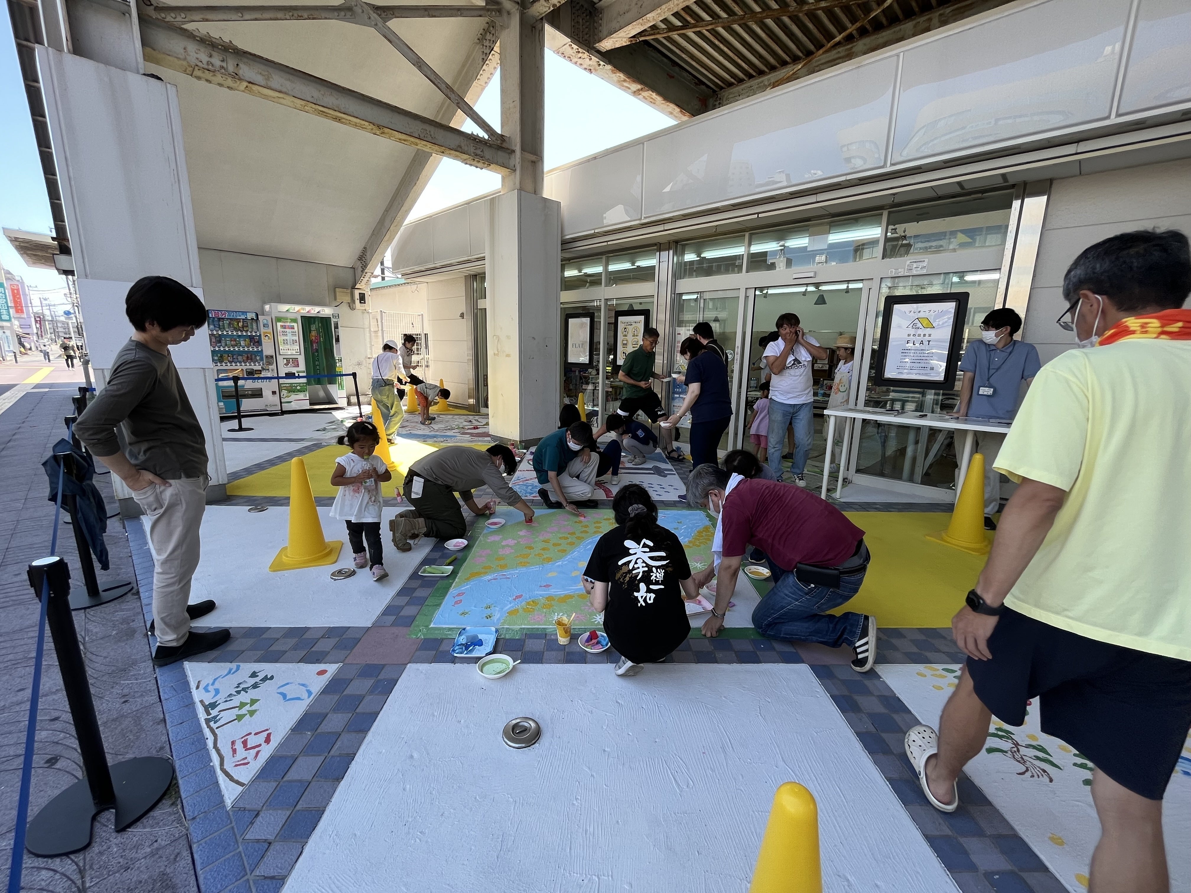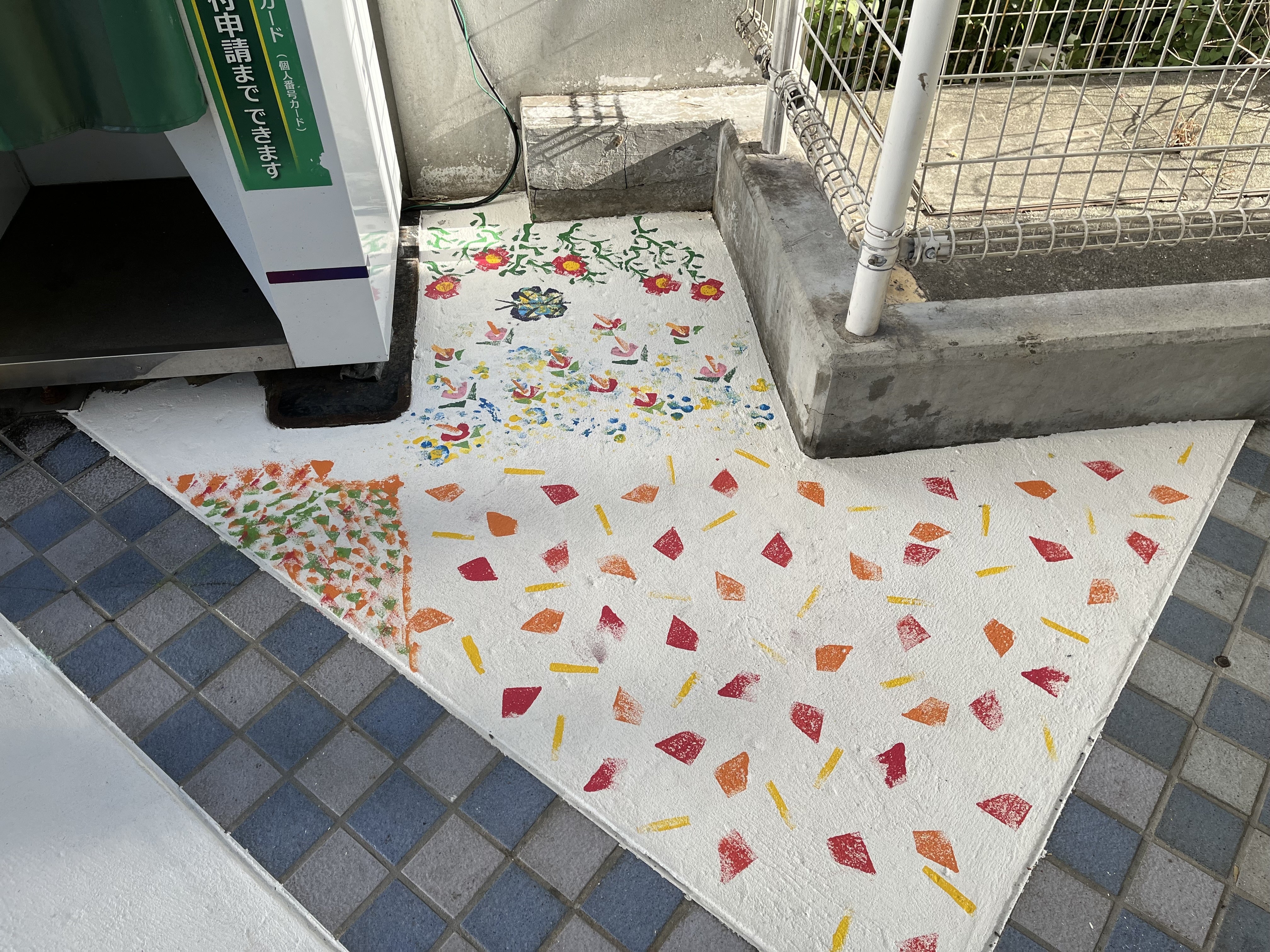 当日は画家のikuiroさん指導のもと、4グループに分かれて、それぞれがデザインをゼロから考えました。スポンジを様々な形に切ってスタンプを作り、青赤黄そして白のペンキを混ぜて色を作り、真っ白な床の上に押してしていきます。