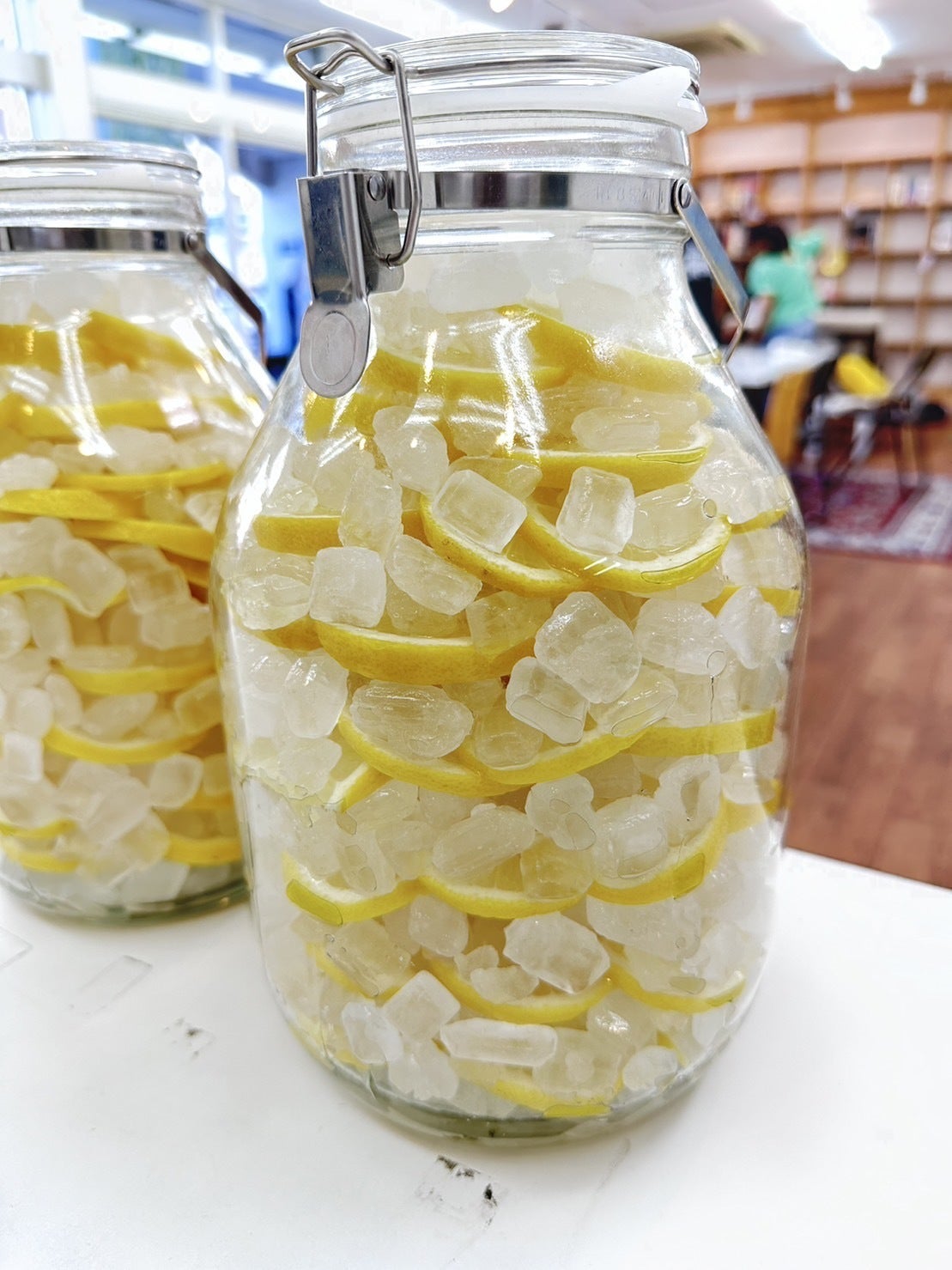 室長中村と図書委員長松本で50個のレモンを切りまくりました(笑)大量のレモンは、ご近所の八百屋・フルーツ太陽さんにお願いして仕入れることができました。駅東口ロータリーの、吉野家さんとファミリーマートさんの間にある老舗の八百屋さんです!
