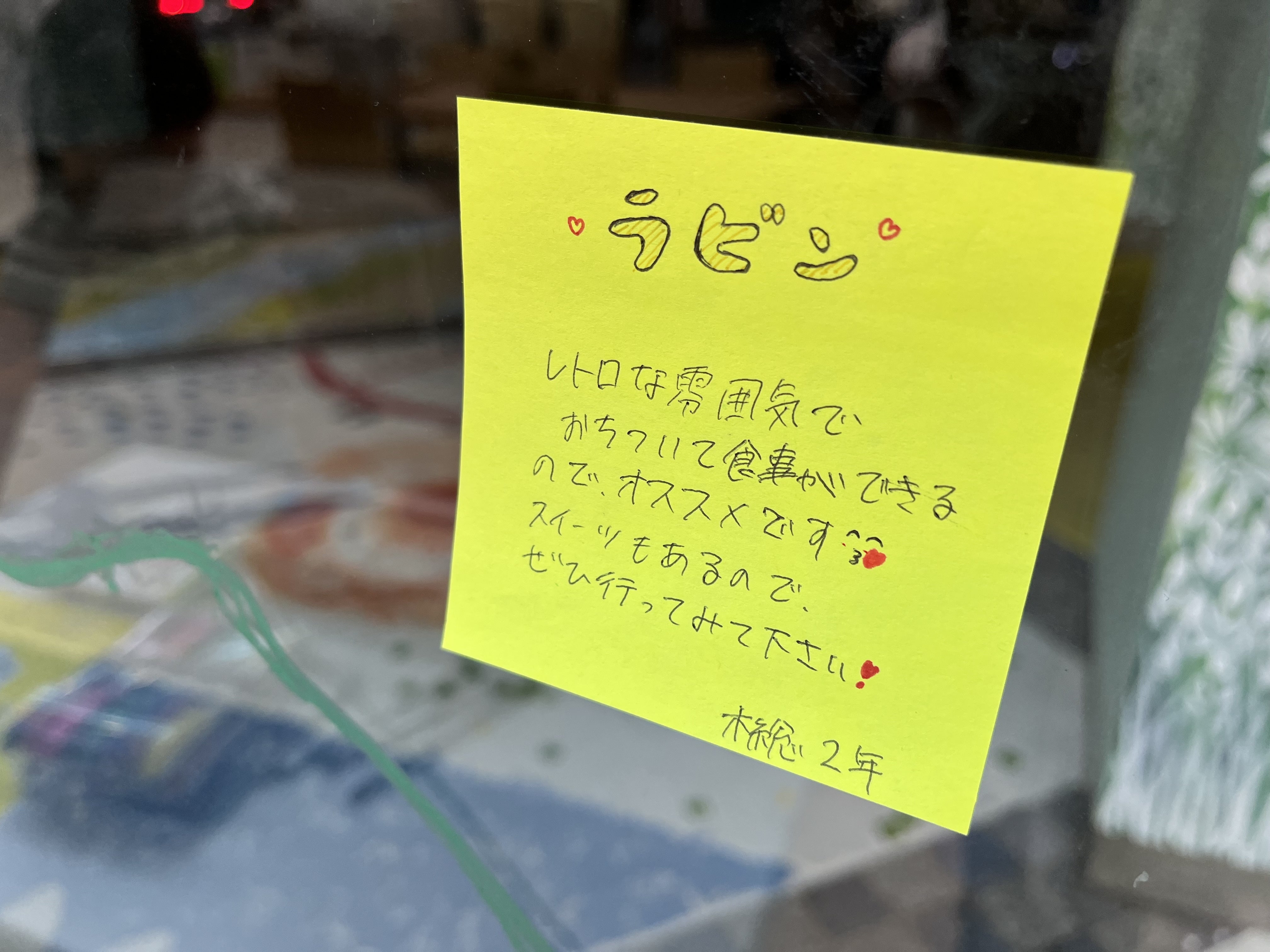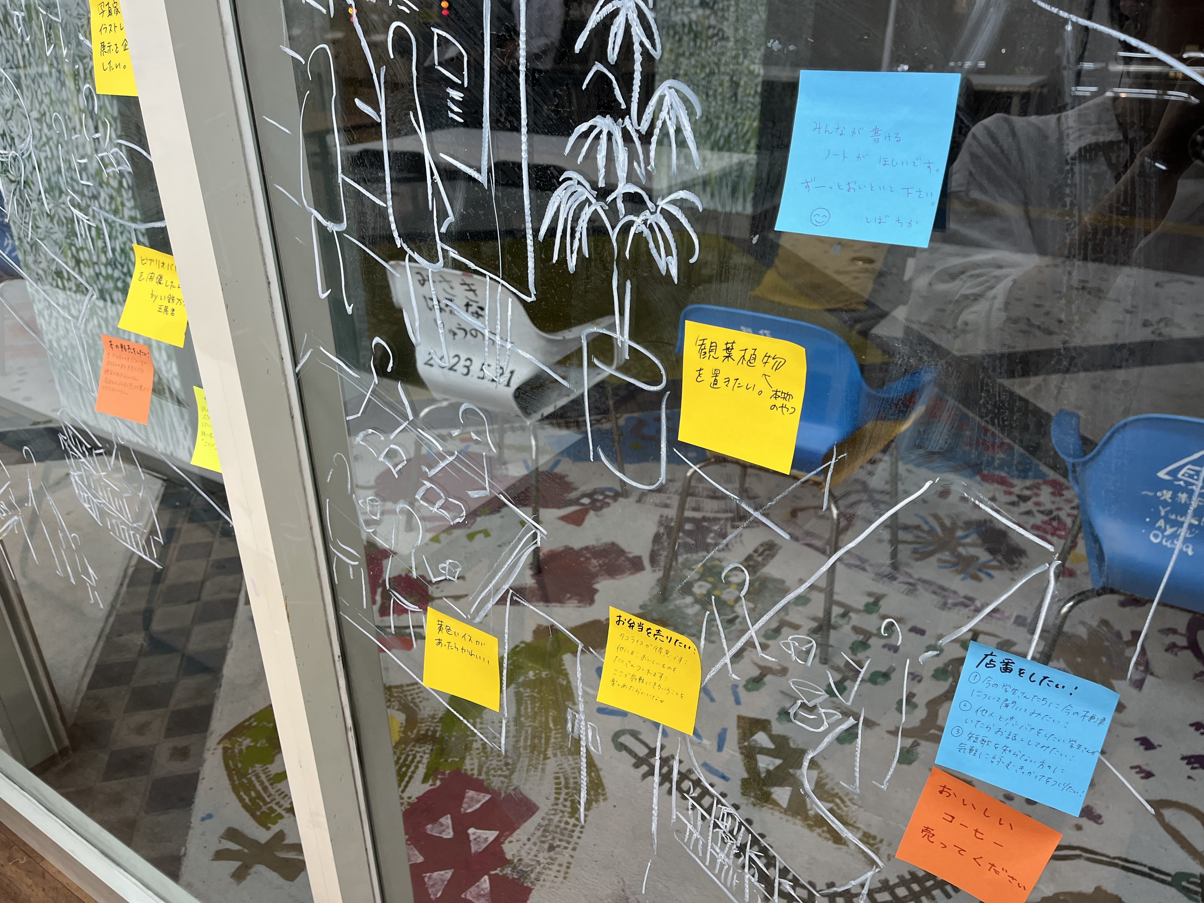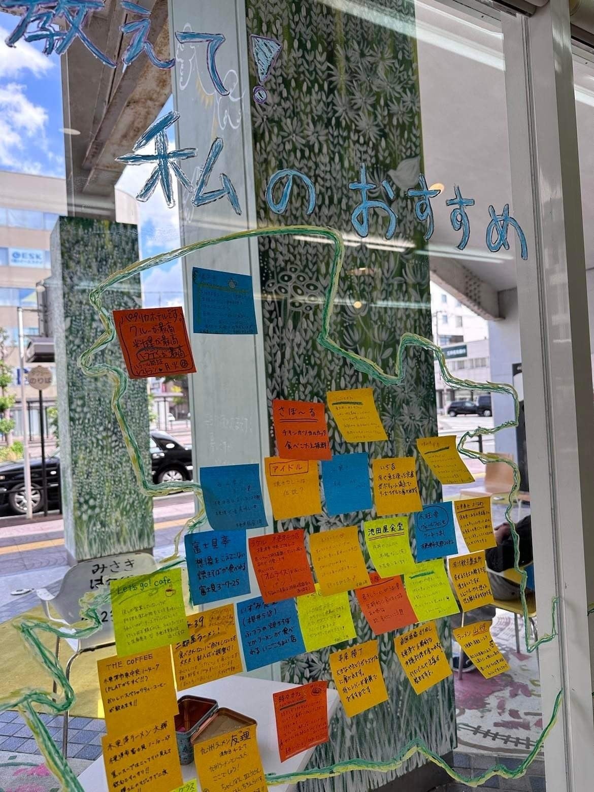 窓ガラスには、手のひら工房さんとikuiroさんから寄付いただいたキットパス(ガラスに描けるクレヨン)を使って、市内のおすすめ飲食店をふせんで貼るコーナーを作りました。