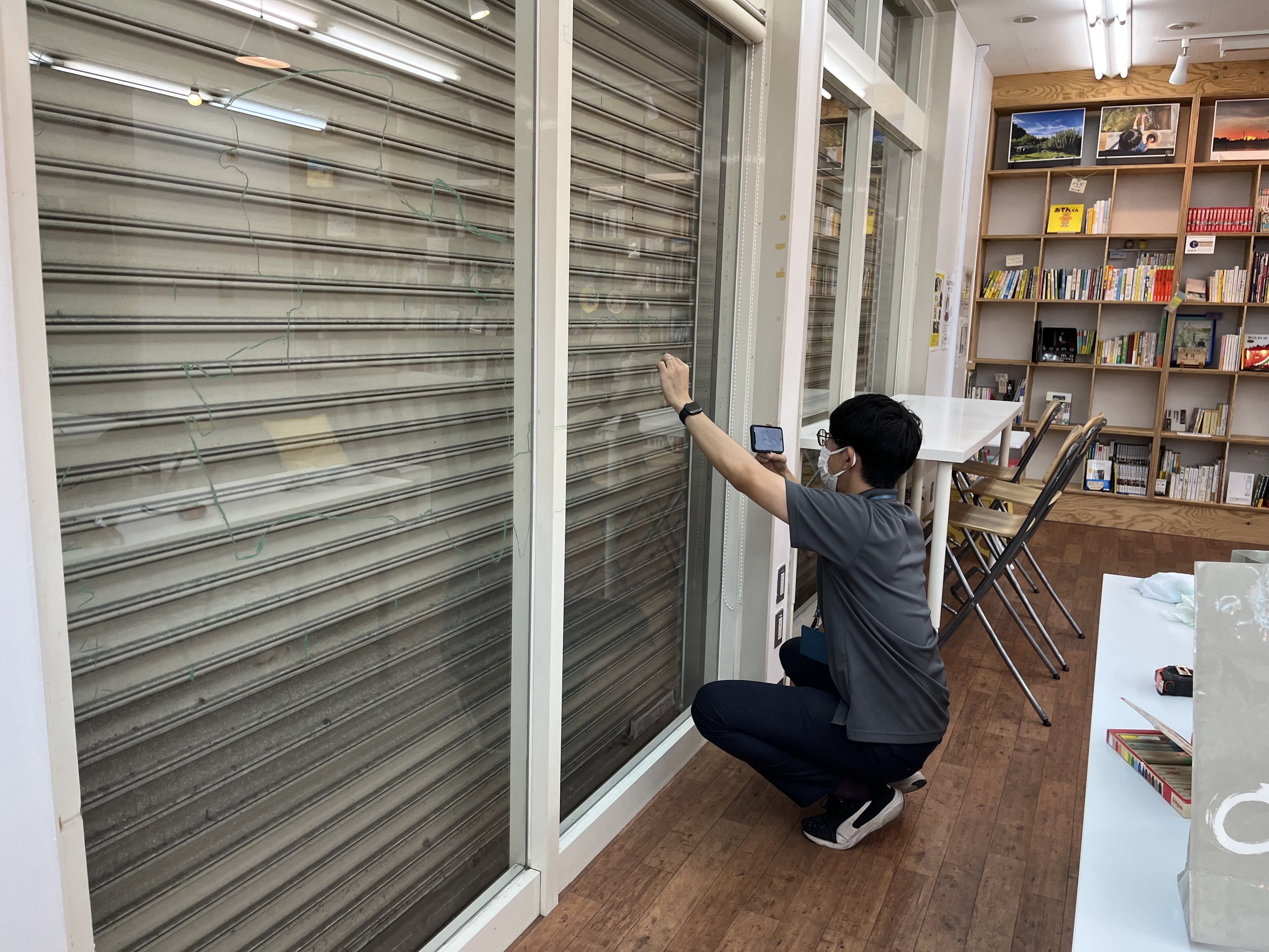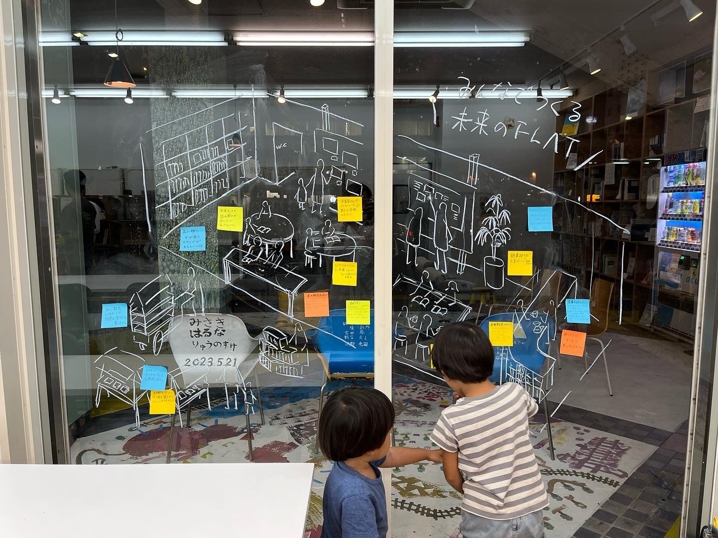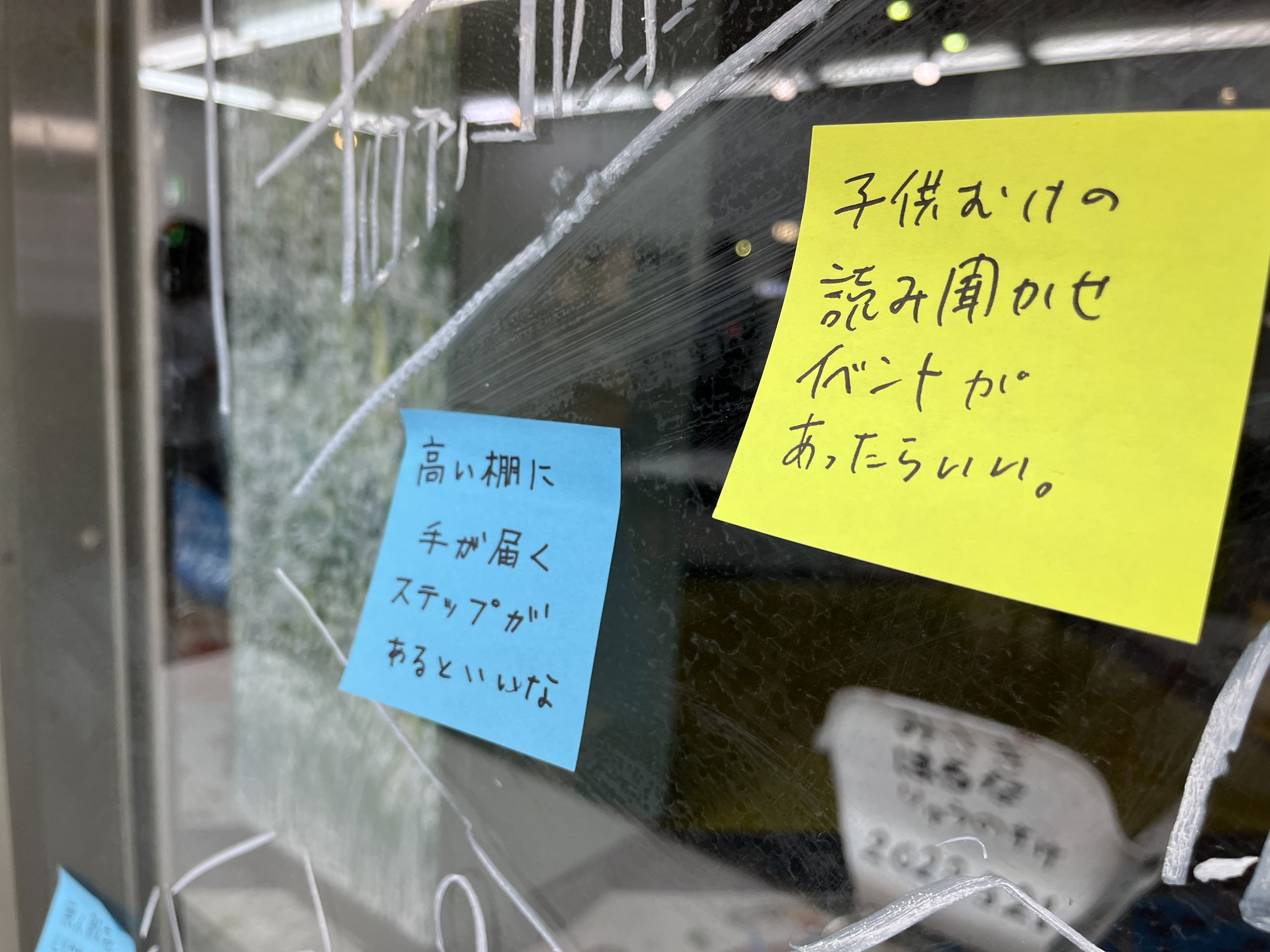 窓ガラスには、手のひら工房さんとikuiroさんから寄付いただいたキットパス(ガラスに描けるクレヨン)を使って、市内のおすすめ飲食店をふせんで貼るコーナーを作りました。