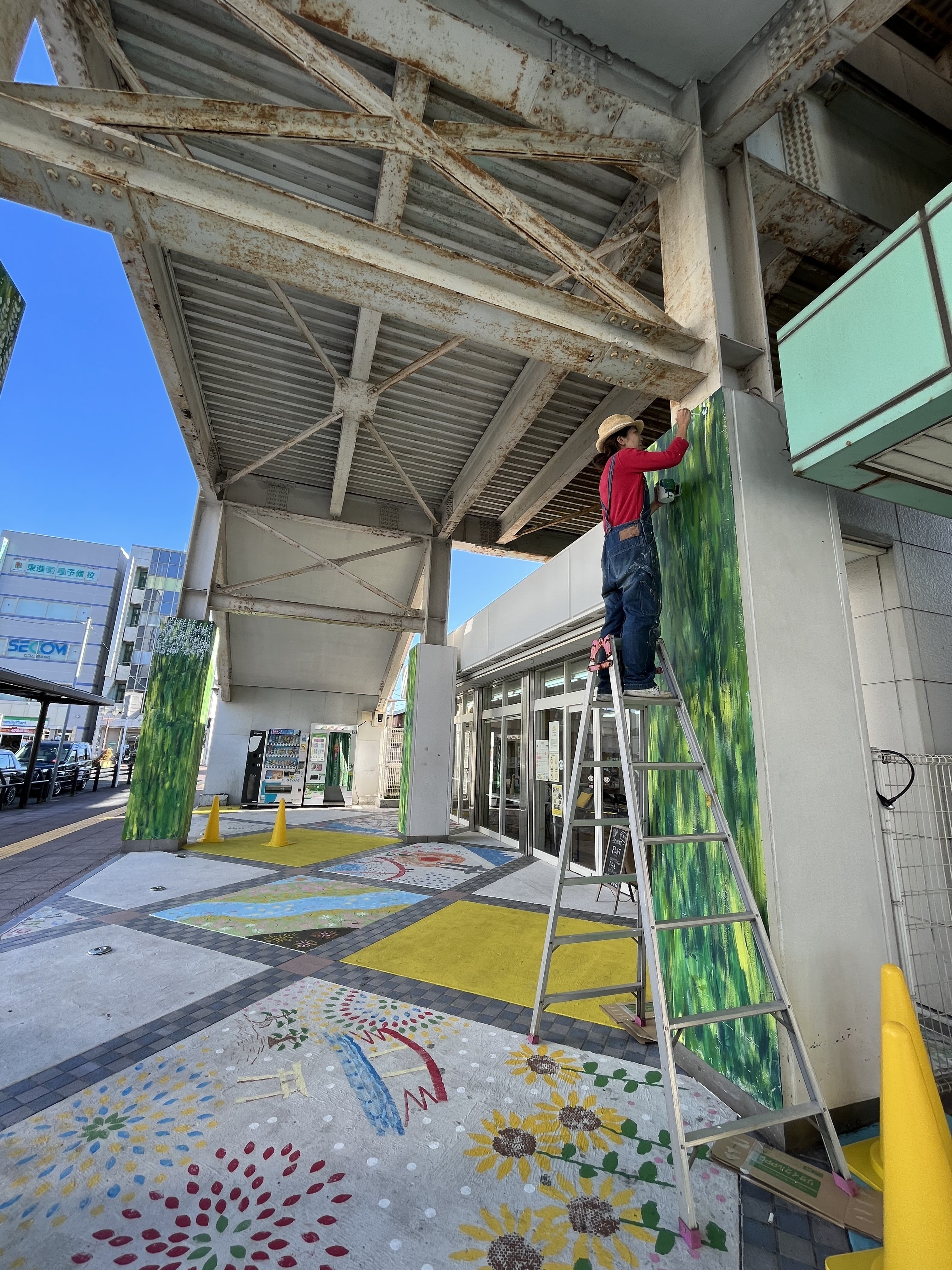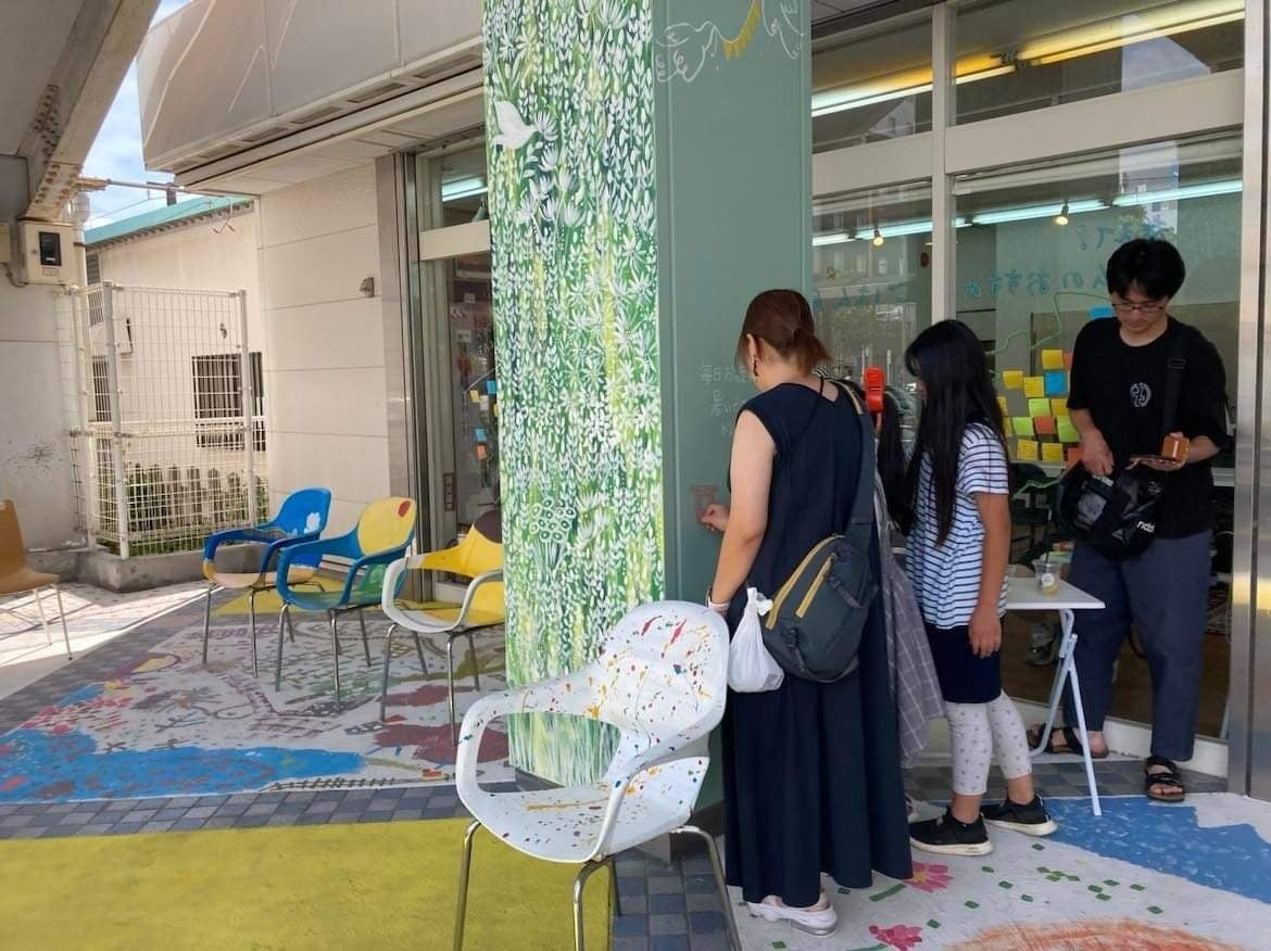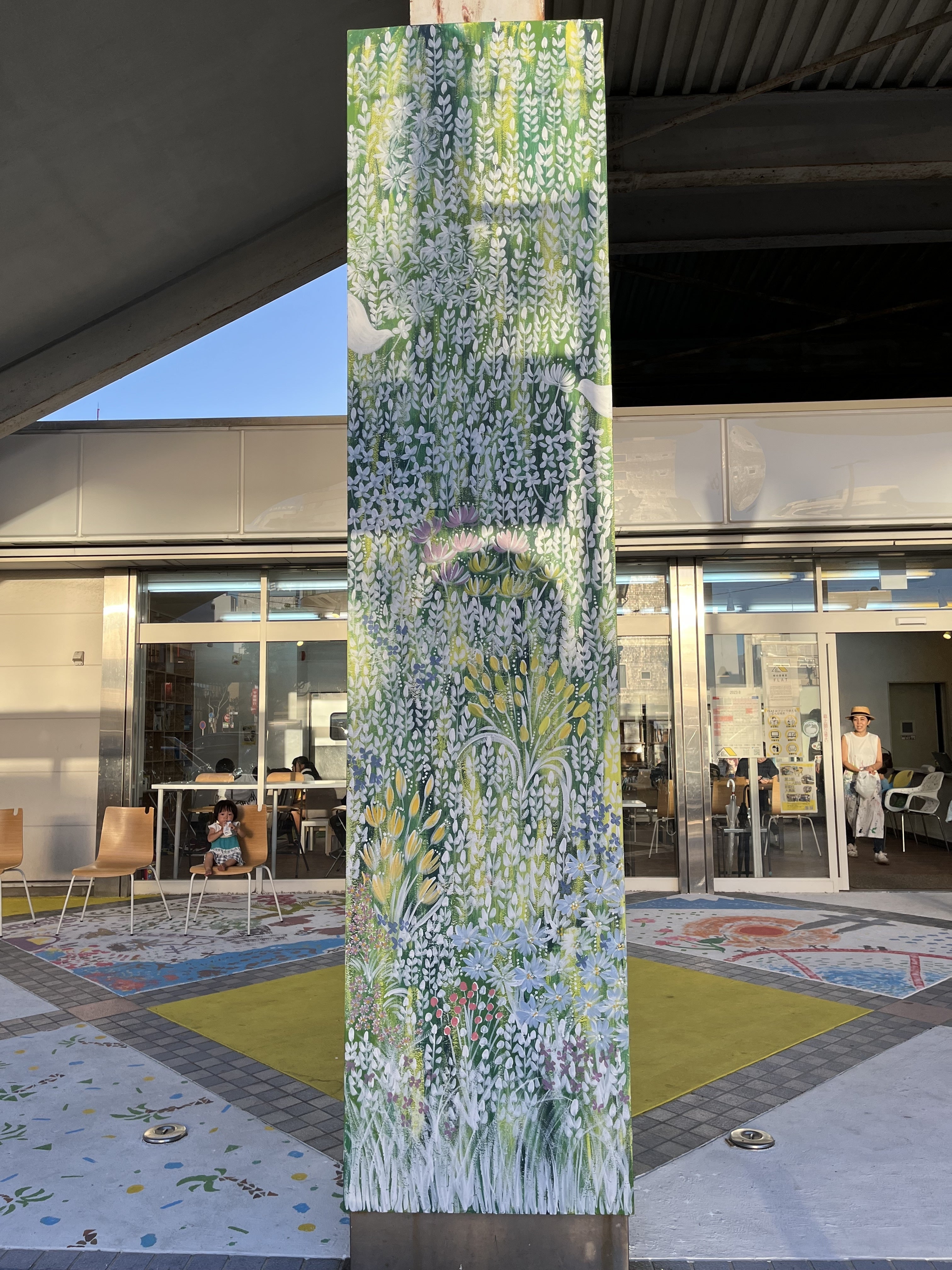 グランドオープンに合わせて、床塗りワークショップで講師を務めてくれた画家のikuiro いくちゃんに、店前の柱の絵を描いてもらいました。