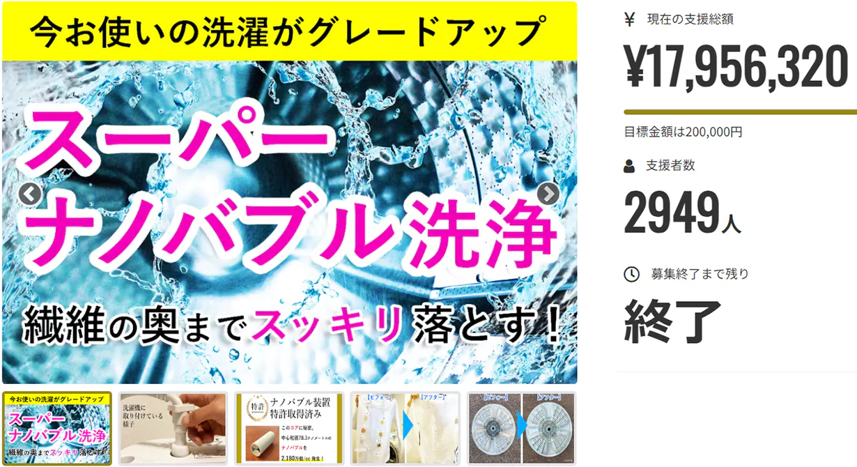 下記、第一弾「洗濯機スーパーナノバブルアダプター」では、2,949名の方にご支援を頂きました。プロジェクトのご支援様のおかげもあり、さらにナノバブル製品の開発をすることができました。この場をお借りして、感謝申し上げます。ありがとうございます。