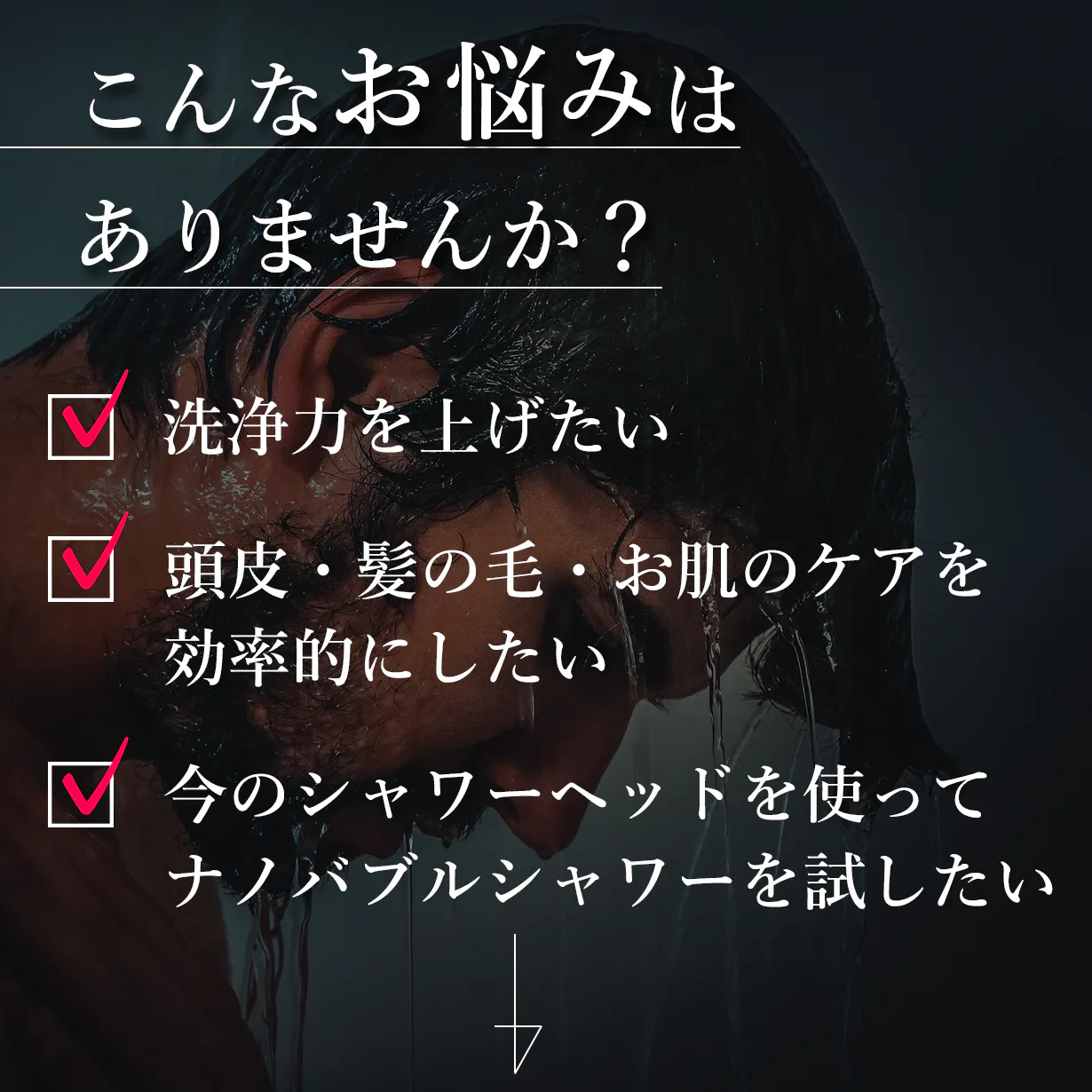 今お使いのシャワーヘッドをそのまま使って、ナノバブル水により「頭皮やお肌の汚れケア」「保湿」「保温」が期待できる商品です。