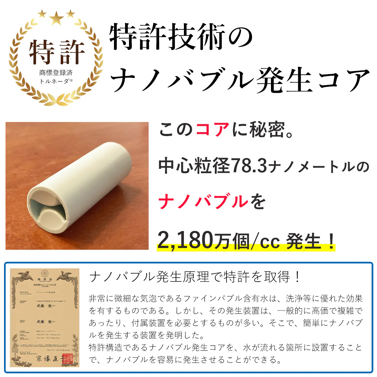 取り付け簡単。しかも、ランニングコストはかからず、毎日のシャワーがナノバブルに!ナノバブル発生装置として、特許取得構造のコアを使用しております。独自のスーパーナノバブルで毛穴よりも小さなナノバブル水なので、髪の毛やお肌もスッキリ!
