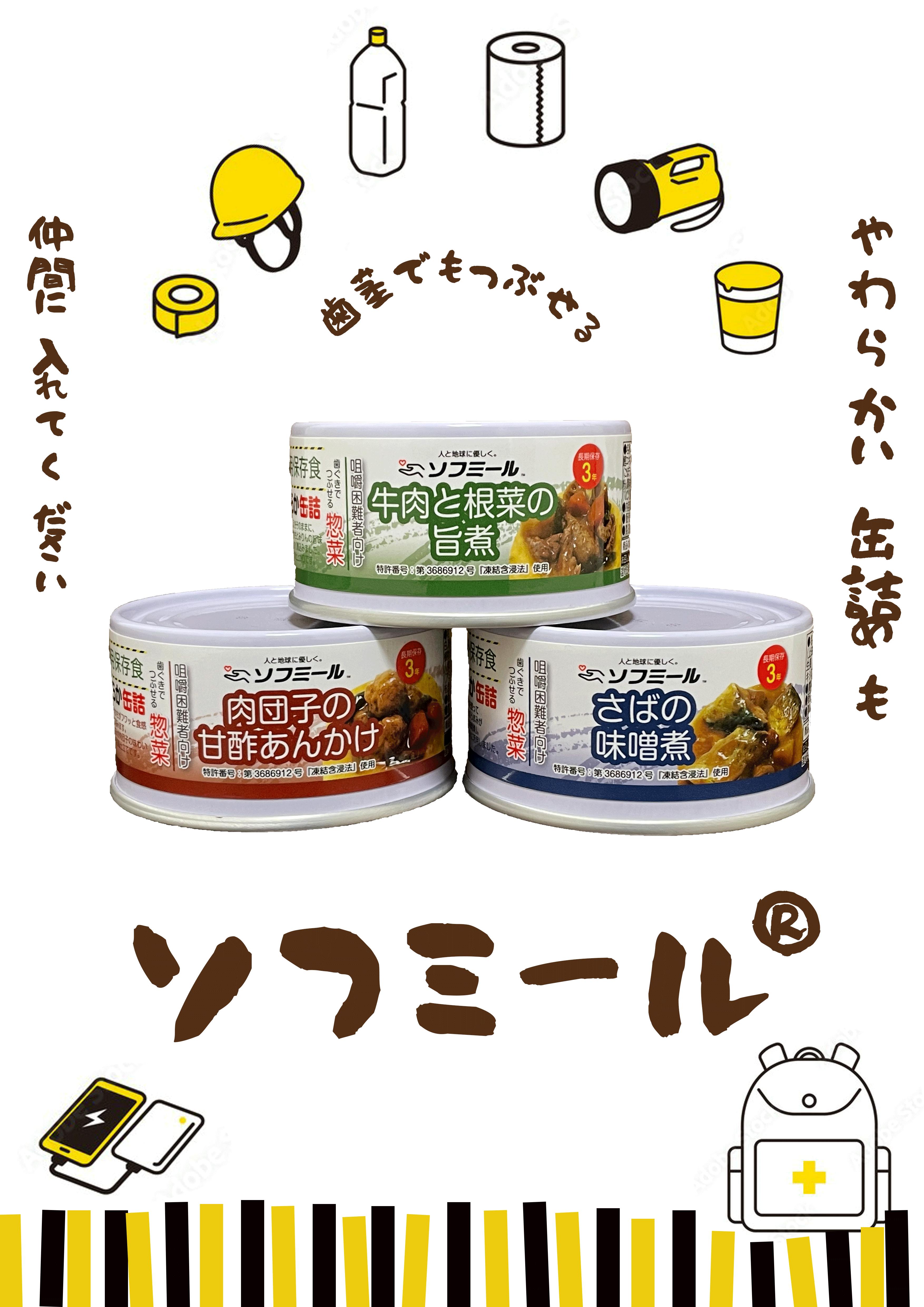 東日本大震災で被災された方からの声から生まれた『ソフミール やわらか缶詰』は、噛めない・噛みづらいお年寄りの為に開発された長期保存可能なやわらか非常食です。