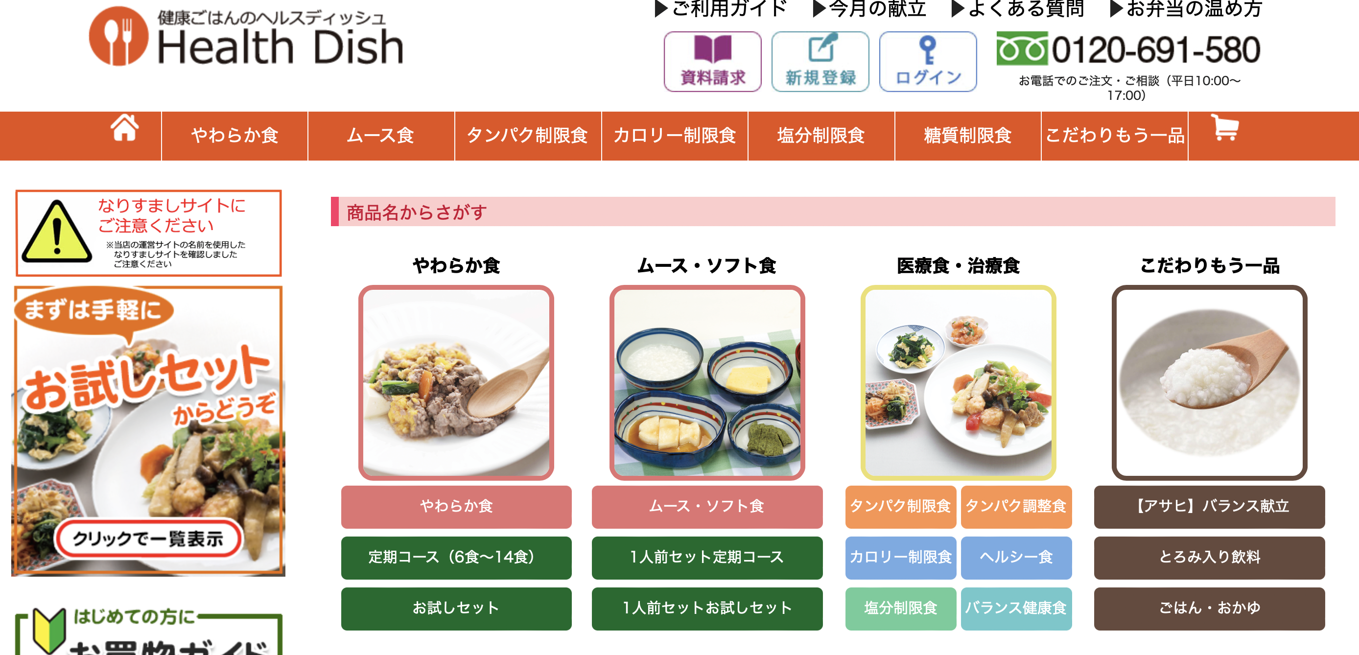 「ヘルスディッシュ」サイトでは、「やわらか食」をはじめとする介護食、医療食などを販売しており、特に「やわらか食」は歯茎で潰せるほどやわらかく、栄養価、食欲をそそる見た目など、自信を持っておすすめできるものです。