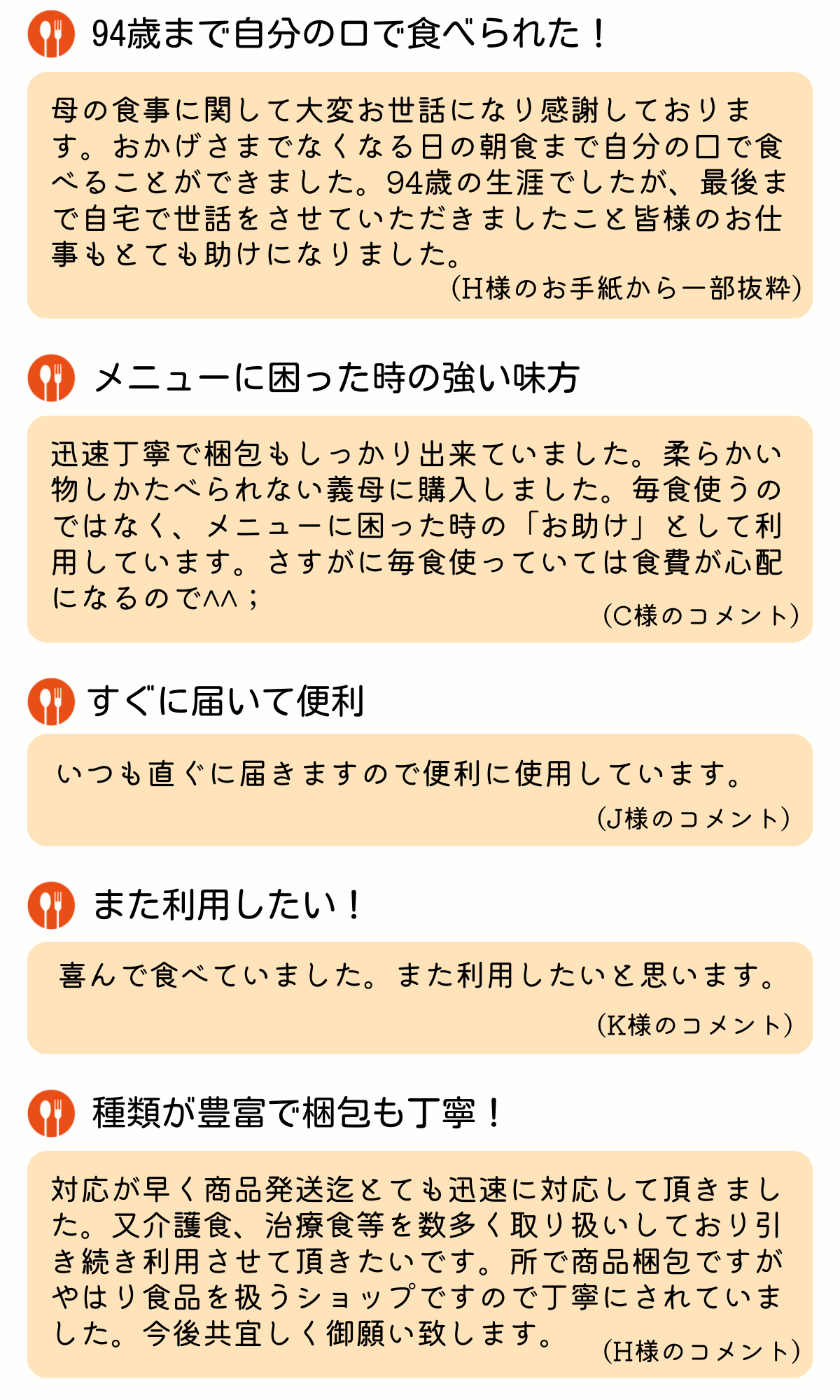 おかげさまで、「おいしい」「こんな介護食は食べたことがない」などという嬉しい声をいただき、リピートしていただく方も増えています。