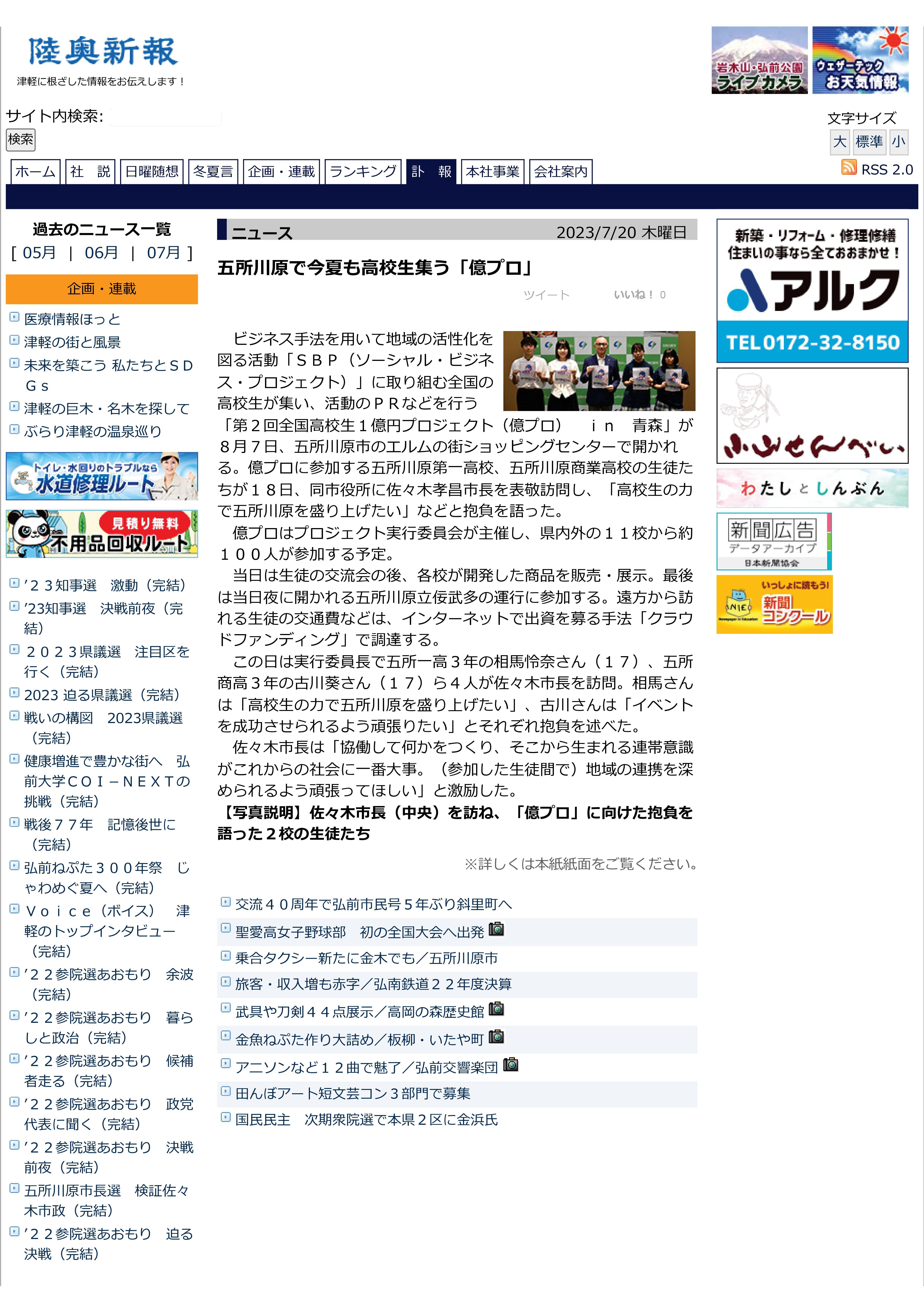 五所川原市長表敬訪問!新聞掲載されました!(その2:陸奥新報)
