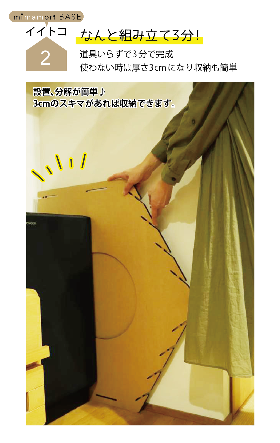ドライバーも釘も不使用で組み立ては3分。使わない時は分解して厚さ3cmになるから、隙間にスッキリ収納できます。DIYができなくても安心して1人だけで組み立てできるのはうれしいポイント。