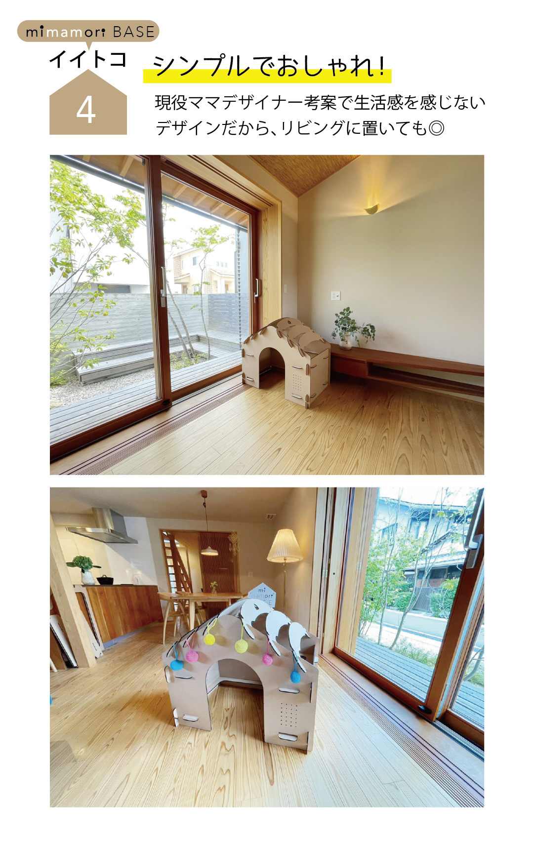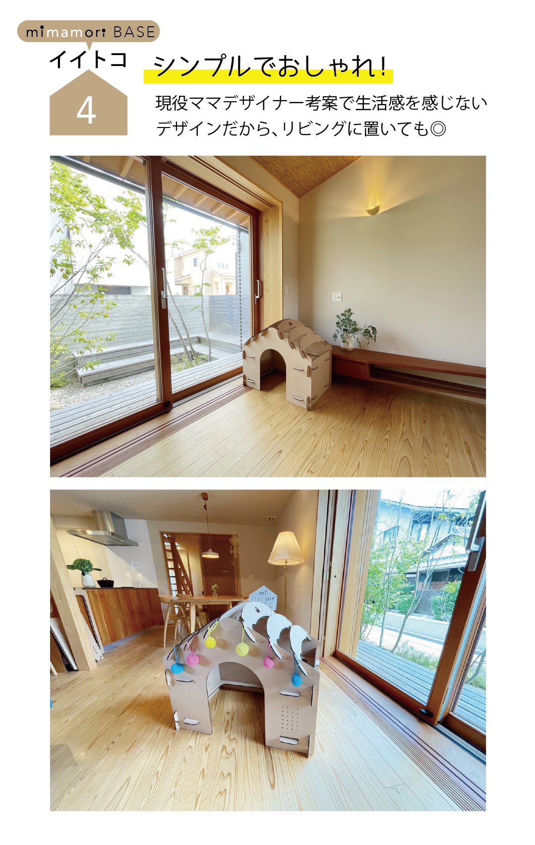 mimamori BASEは、子どもにも親(特にママ)にもうれしい商品を生み出すべく、周りにいるママや、たくさんの方の協力を経て生まれました。 私自身、子どもが3歳~小学生にあがる頃は、子どもの居場所となる基地のような場所を用意してあげたいという想いがありました。しかし、これがいい!と思えるような商品に出会えませんでした。リサーチすると、ダンボールハウスが検索結果にでてくることはありましたが、害虫が苦手な私にとっては選択肢に入らず、ティピーテントはかわいいけれど小ぶりのものが多く、子供が大きくなる過程で長く使えなさそうということで、選択肢から外れました。また、木製の小屋のようなものもあり、とても丈夫そうですが、私にとっては高額で手が出せませんでした。