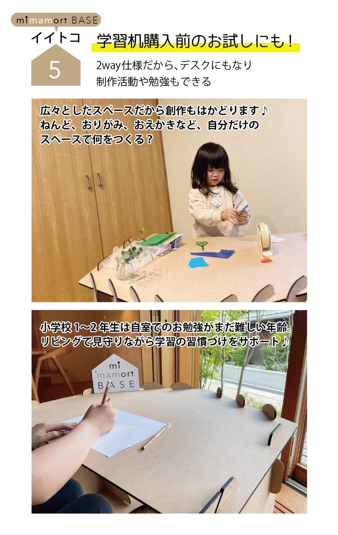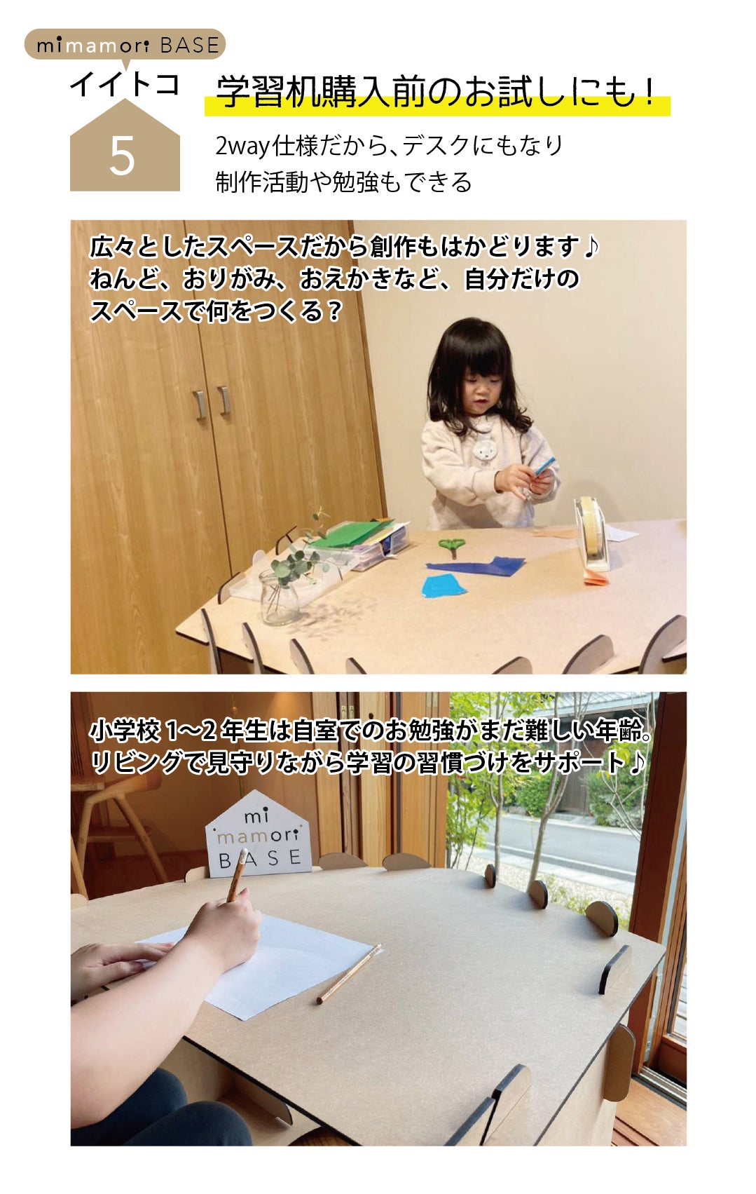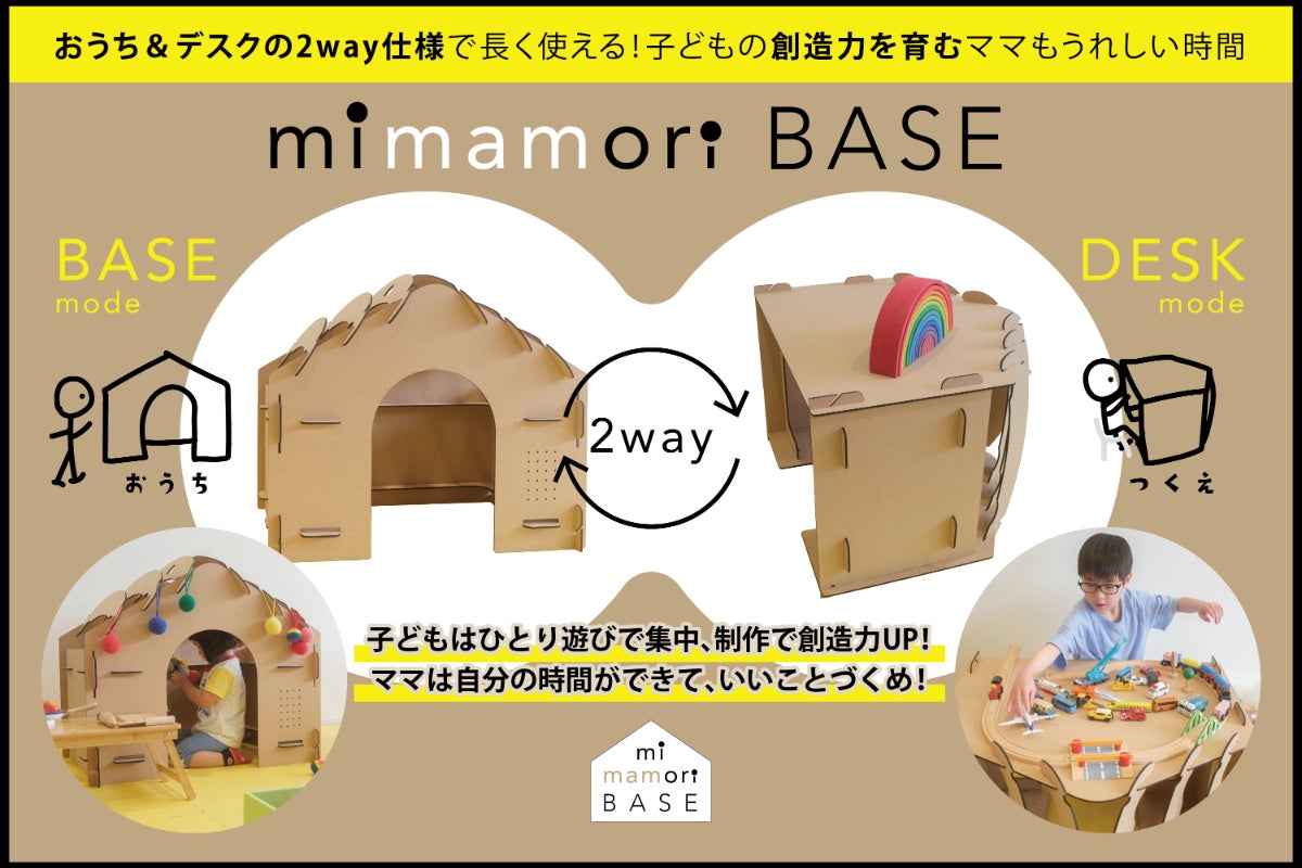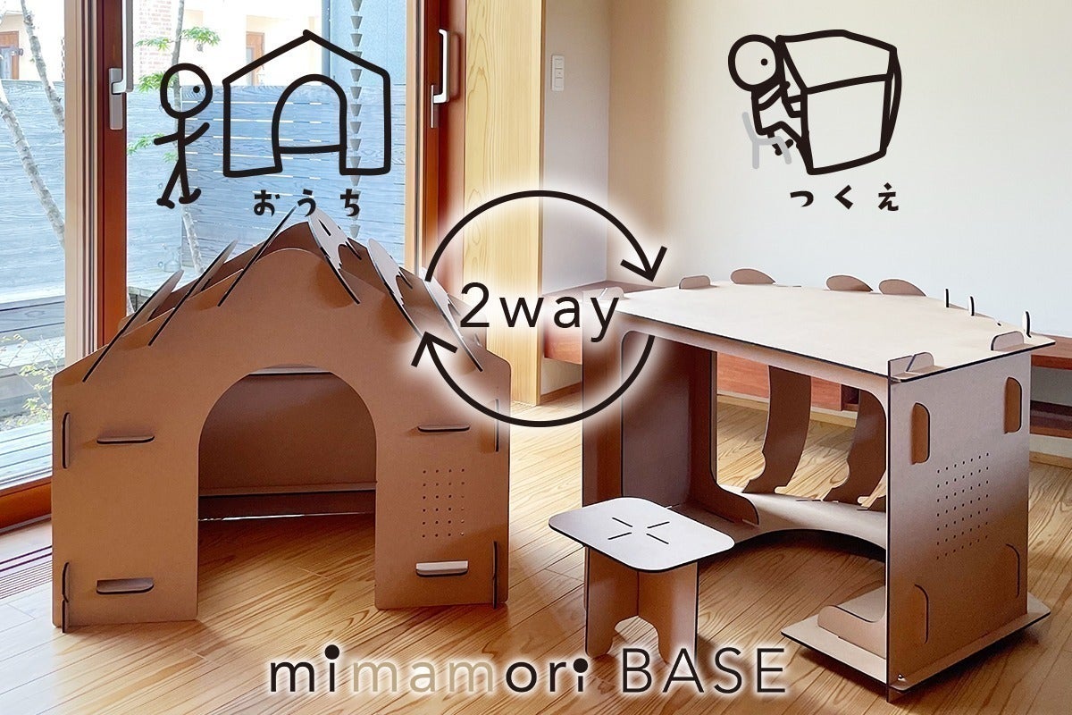 子どもの創造力を育み、親子それぞれの健やかな時間をつくるきっかけになるmimamori BASEは、横に倒すだけでデスクになる2way仕様の新アイテムです。