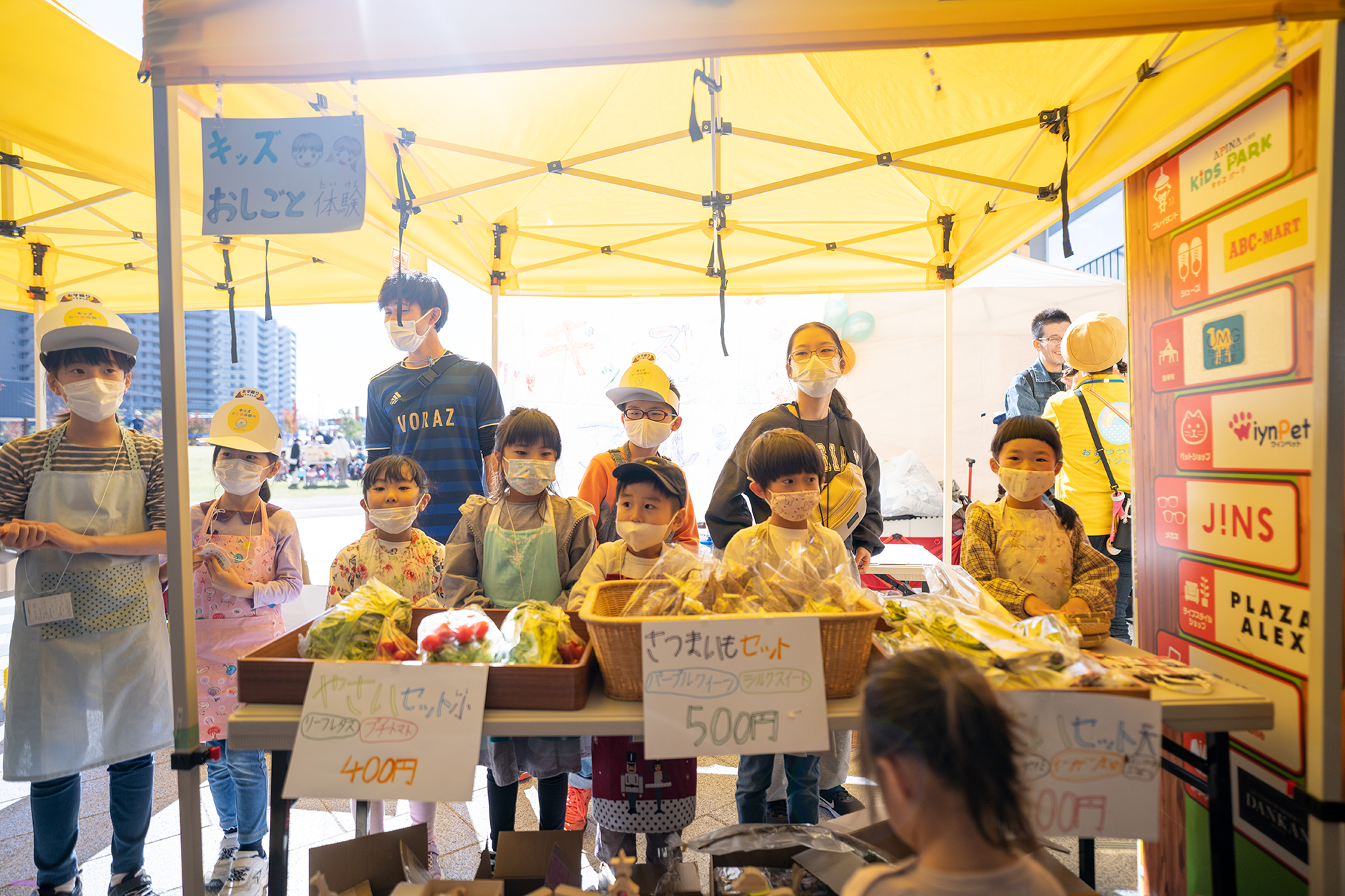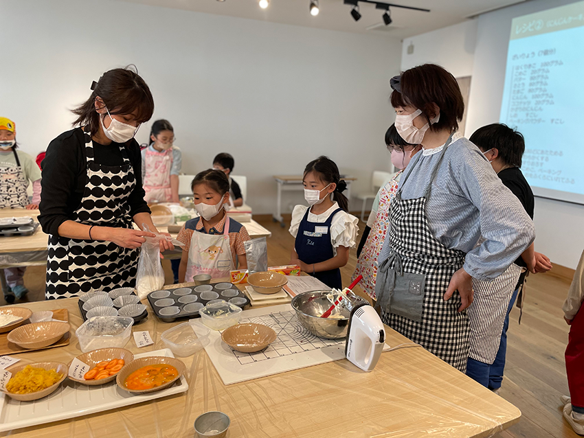 あるがママfesでは、「キッズお仕事体験」という、いつも満席になる企画もあります。子どもたちが接客をしたりカートを押して売り歩きをしたり、実際にお金を触ったりして、親御さんと離れてお仕事をしてもらう体験です。2023年のあるがママfes vol.6では、「特産品企画部」として、にんじんを掘って、カフェオーナーさんとお菓子を作って、パッケージデザインも発案して、販売もするというお仕事体験プラスアルファの企画も開催しました。普段できない経験ができたと、親御さんからはご好評をいただきました。