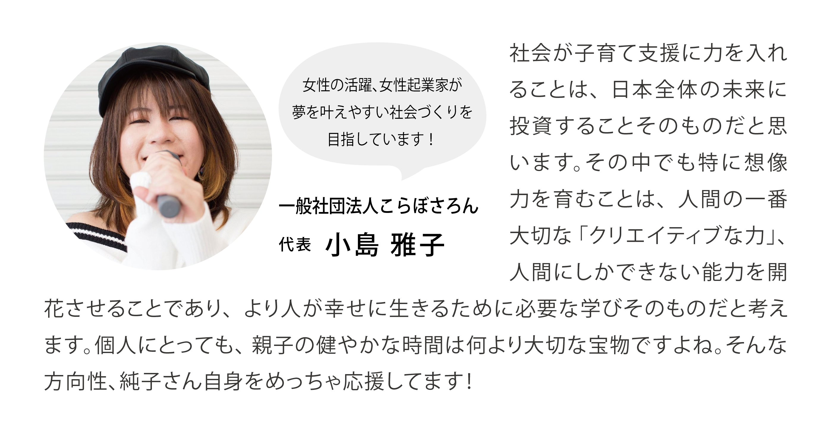 私ができる事は、親も、子も、自分らしく生きられる世の中に近づける為、私自身がワクワクする人生を生きることだと確信しています。子ども達が大人っていいなと感じたり、早く働きたいと感じたり、未来に対して希望を持てるような大人の1人でありたいと強く望んでいます。子ども達に夢を持ってほしいなら、まずは大人自身が夢を持つことが大切だと思っています。