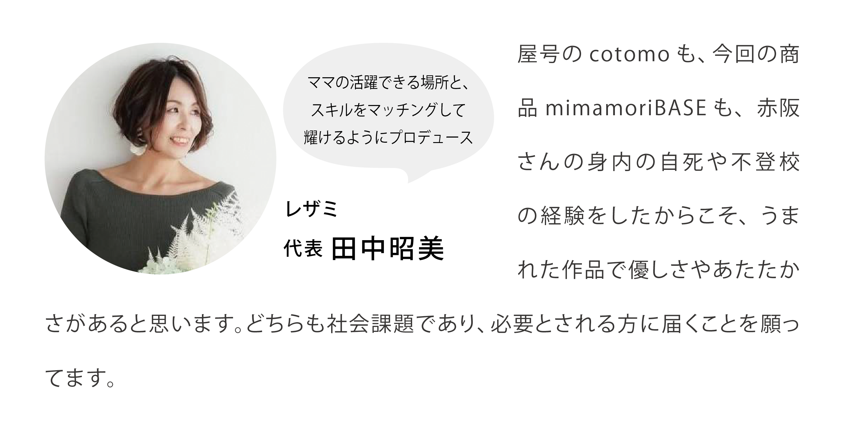 私はこの商品開発を通して、ママのアイデアが生かされることで、ママ自身の経験は価値があるということをたくさんのママに知ってほしいです。そして、世の中のママがどんなに小さな夢でもいいので、それを叶えるために小さな1歩をまずは踏み出してほしいです。夢は1人で叶えるのではなく、たくさんの方に知ってもらって、協力し合って、みんながみんなの夢を応援し会えるような世の中を目指しています。